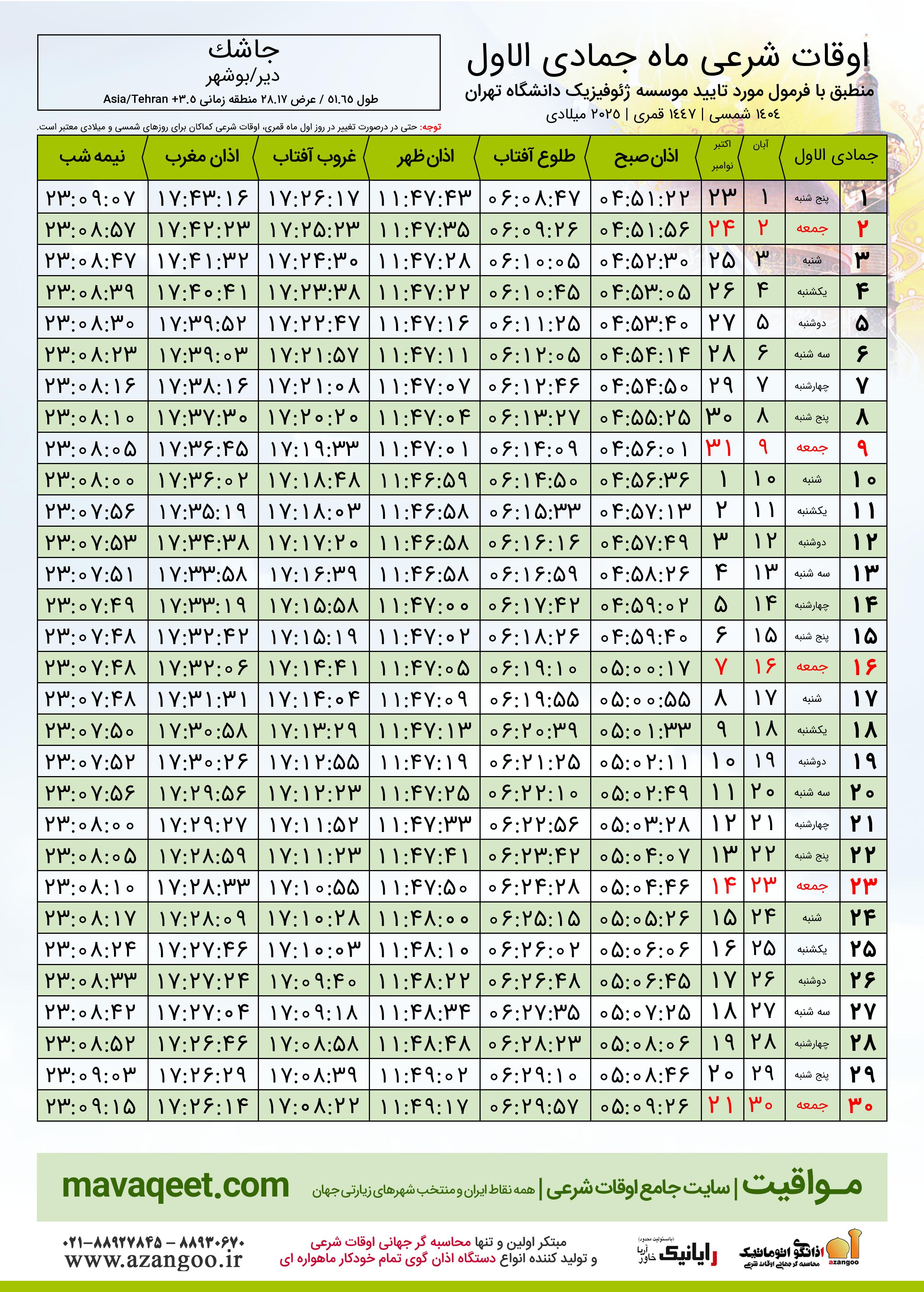 اوقات شرعی ماه جمادی الاول ١٤٤٧ هـ.ق شهر جاشک بر