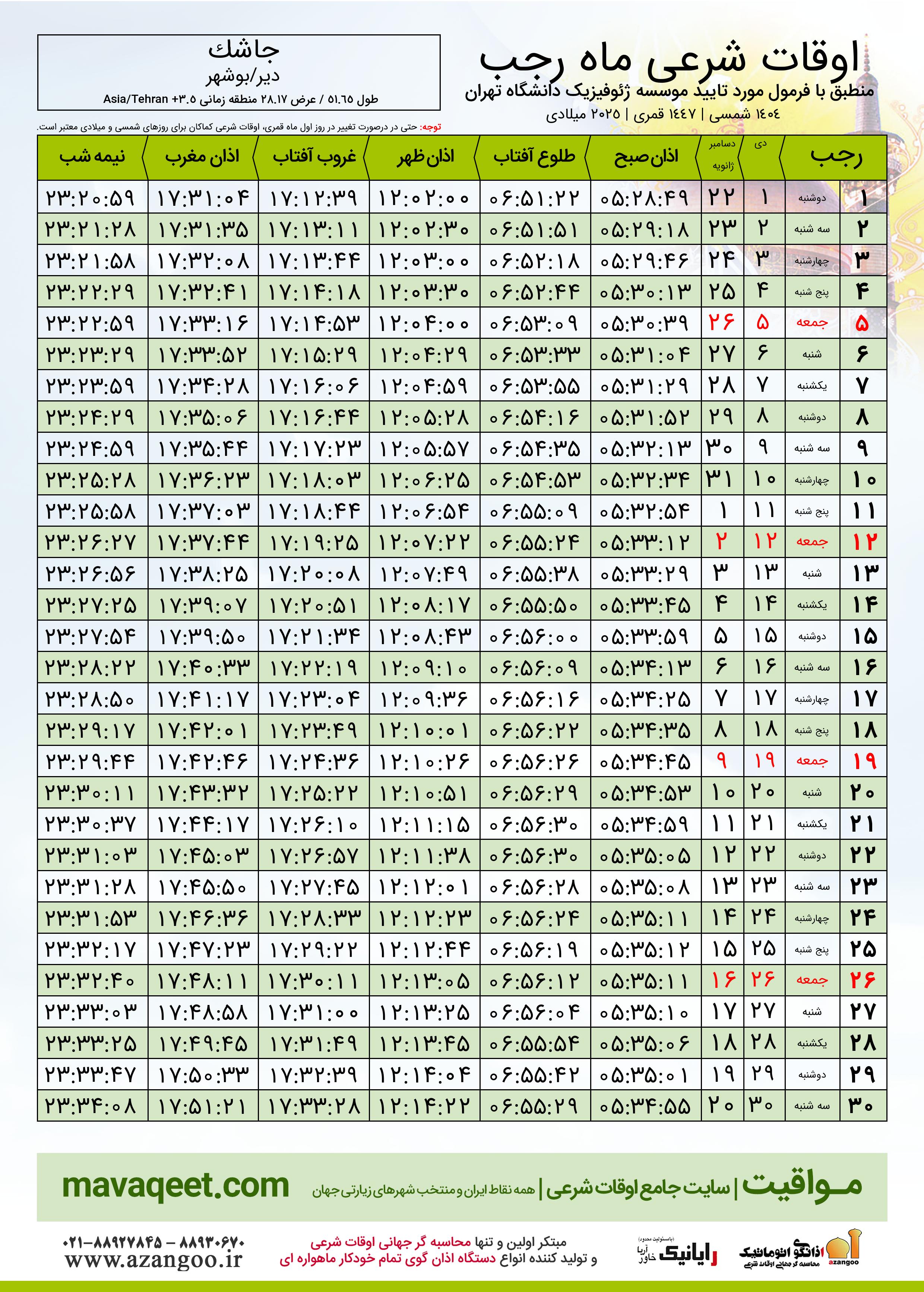 اوقات شرعی ماه رجب ١٤٤٧ هـ.ق شهر جاشک بر