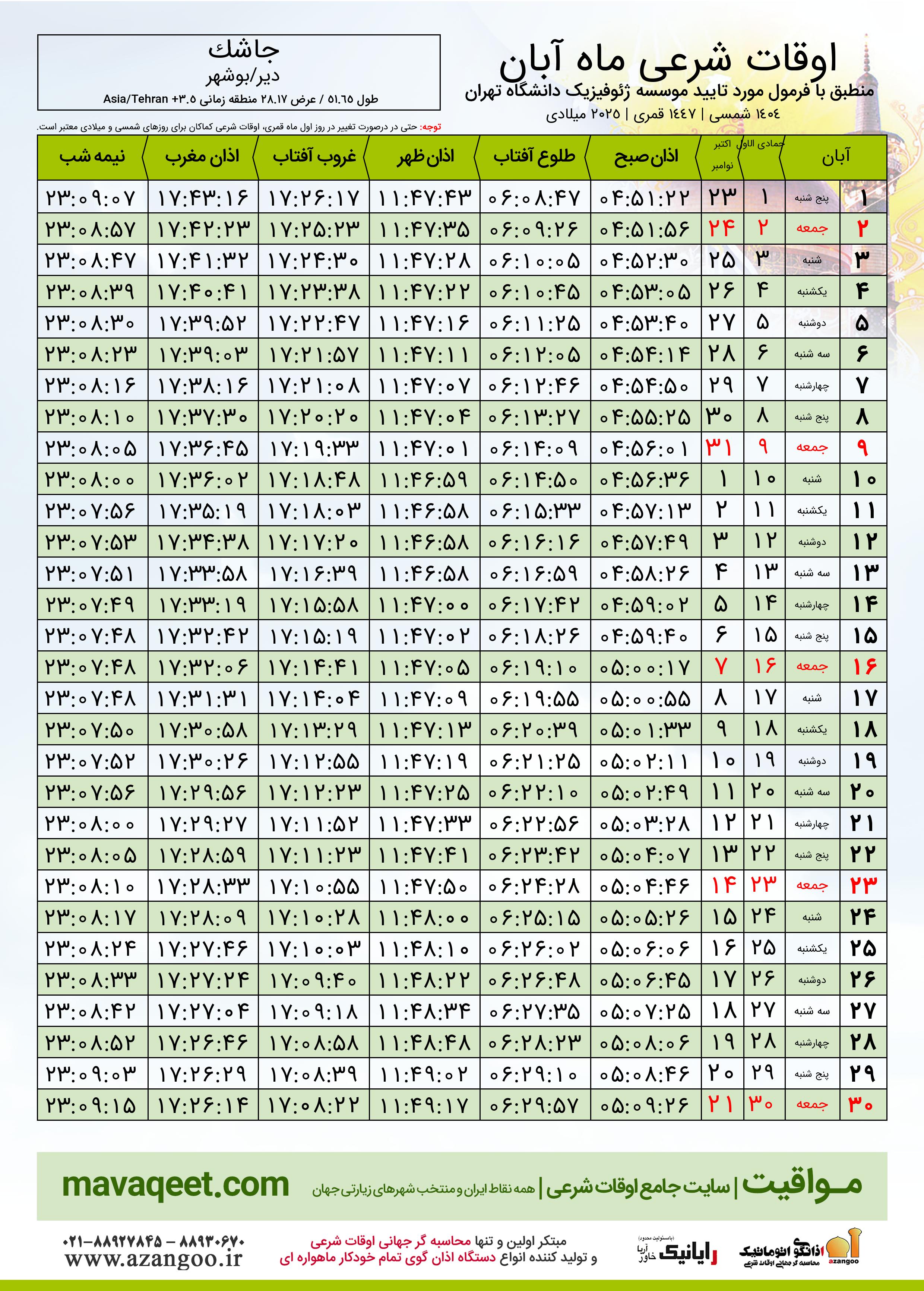 جدول اوقات شرعی آبان ١٤٠٤ شمسی شهر جاشک