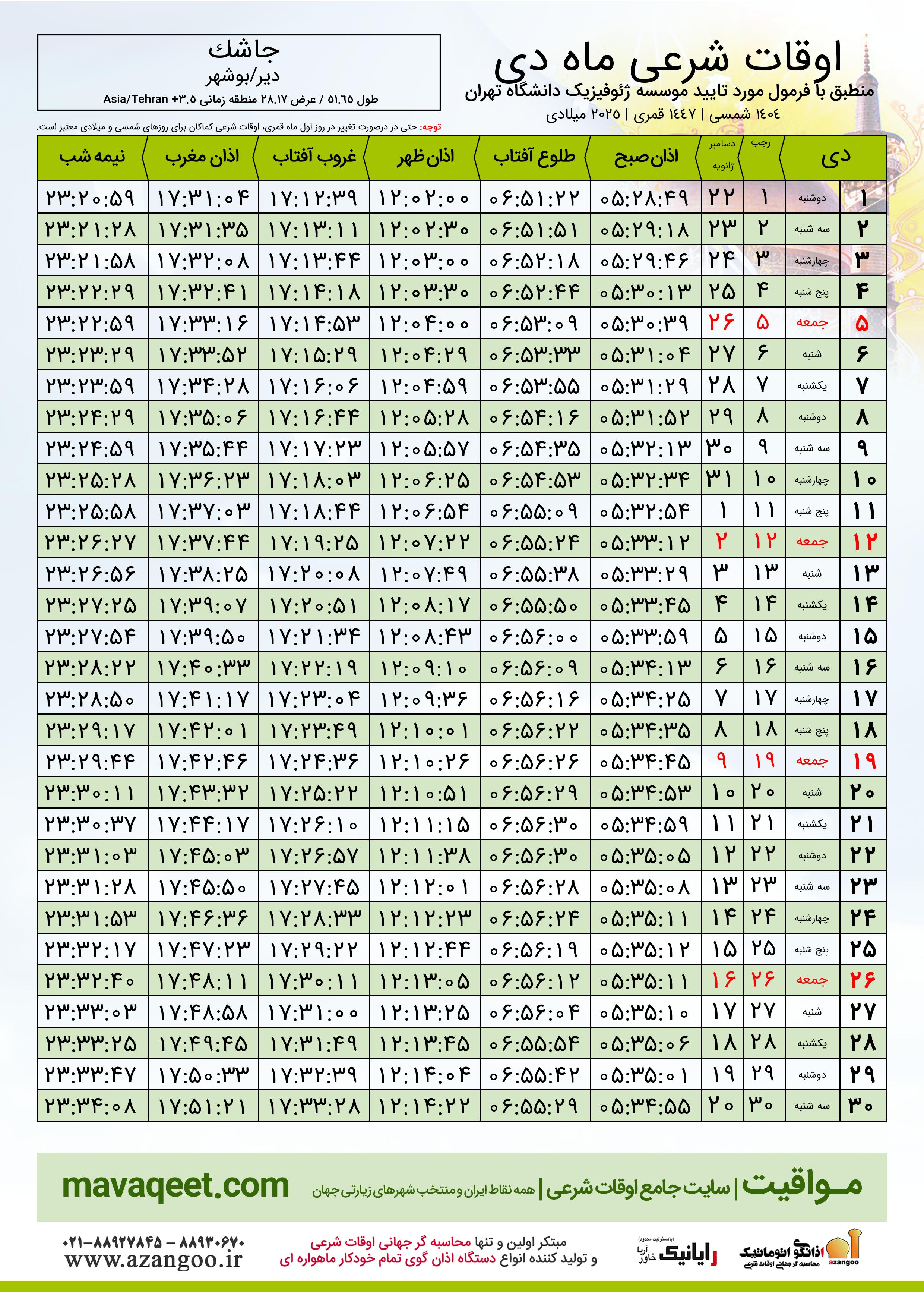 | ٠١ دی ١٤٠٤ | ٠٥:٢٨:٤٩ | ٠٦:٥١:٢٢ | ١٢:٠٢:٠٠ | ١٧:١٢:٣٩ | ١٧:٣١:٠٤ | ٢٣:٢٠:٥٩ |
