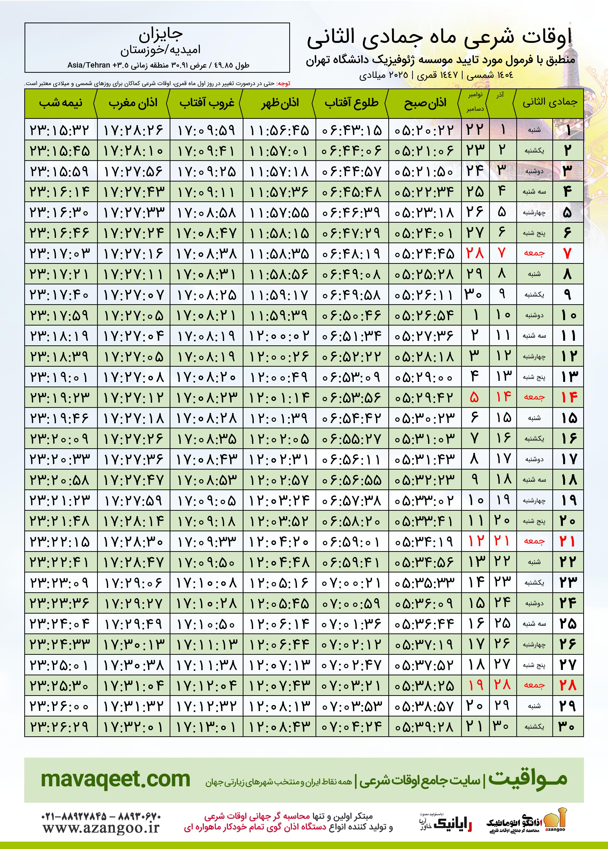 جدول اوقات شرعی جمادی الثانی ١٤٤٧ قمری شهر جایزان