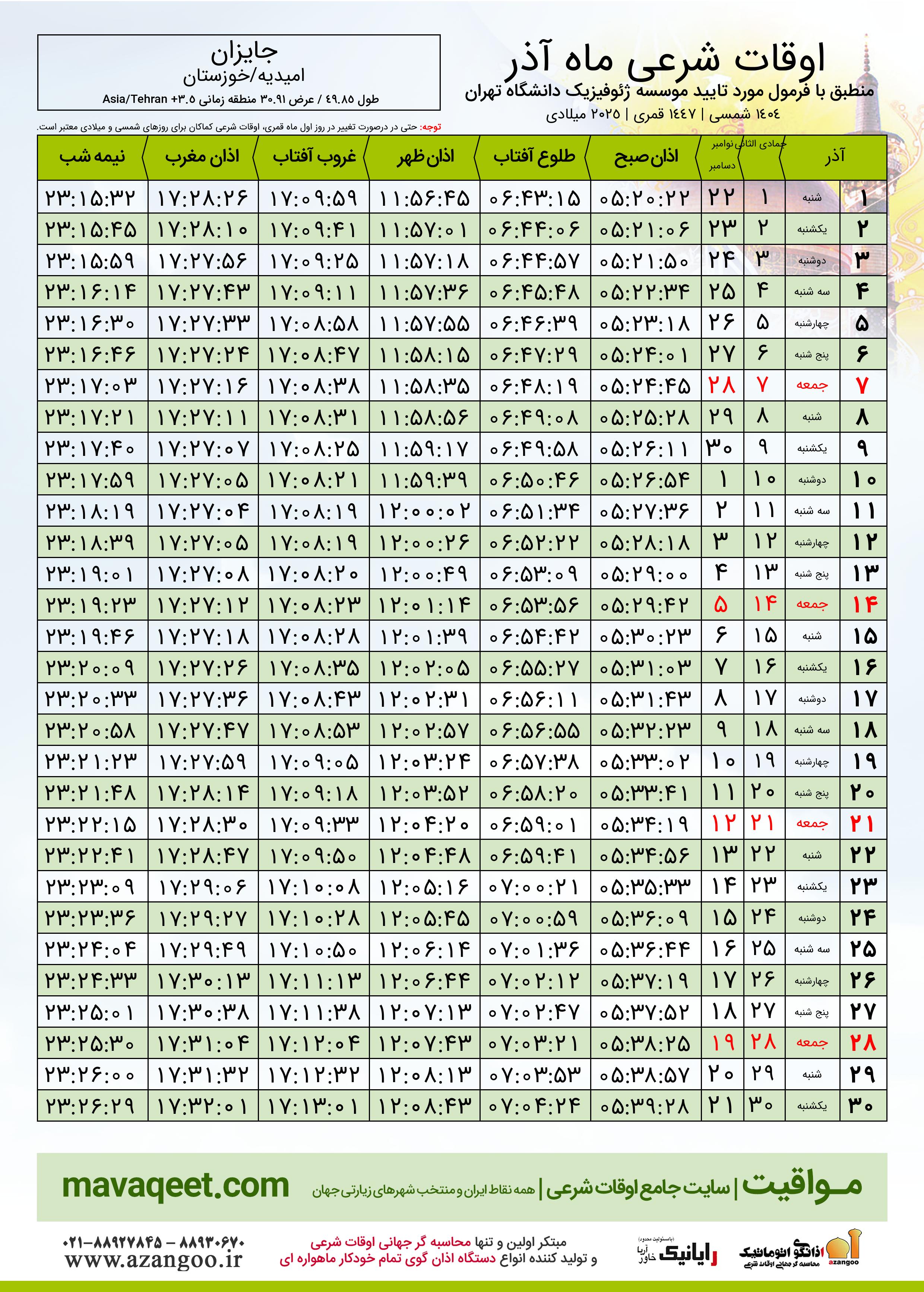 جدول اوقات شرعی آذر ١٤٠٤ شمسی شهر جایزان