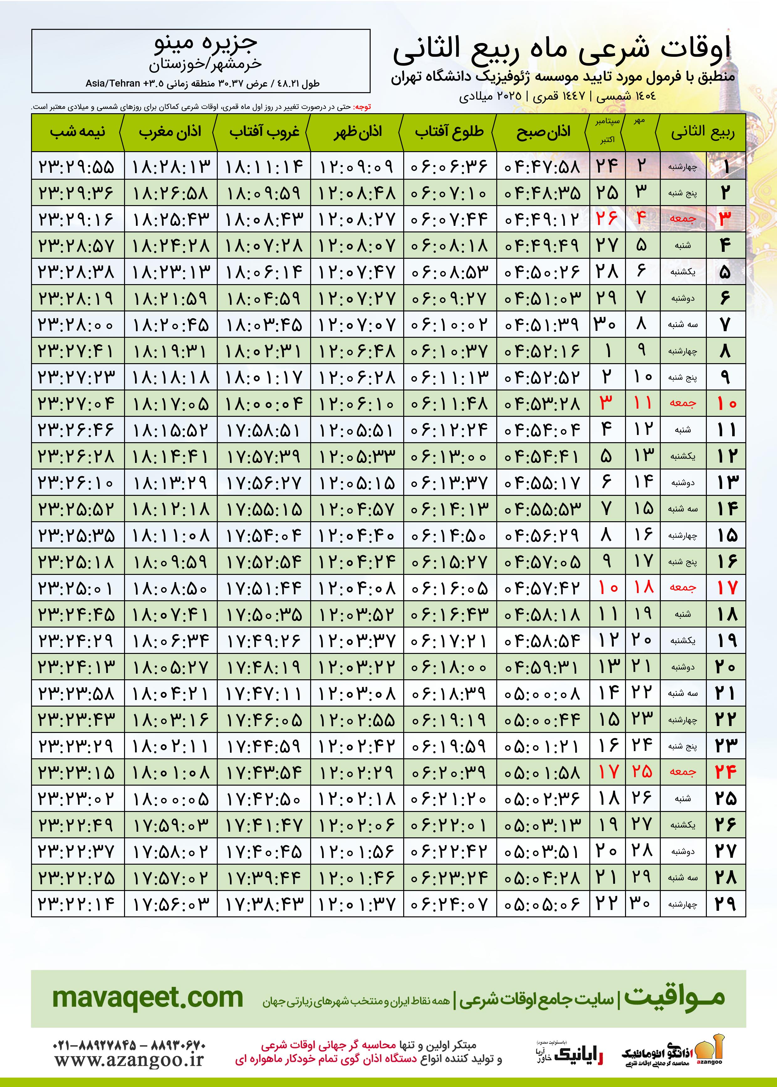 جدول اوقات شرعی ربیع الثانی ١٤٤٧ قمری شهر جزیره مینو