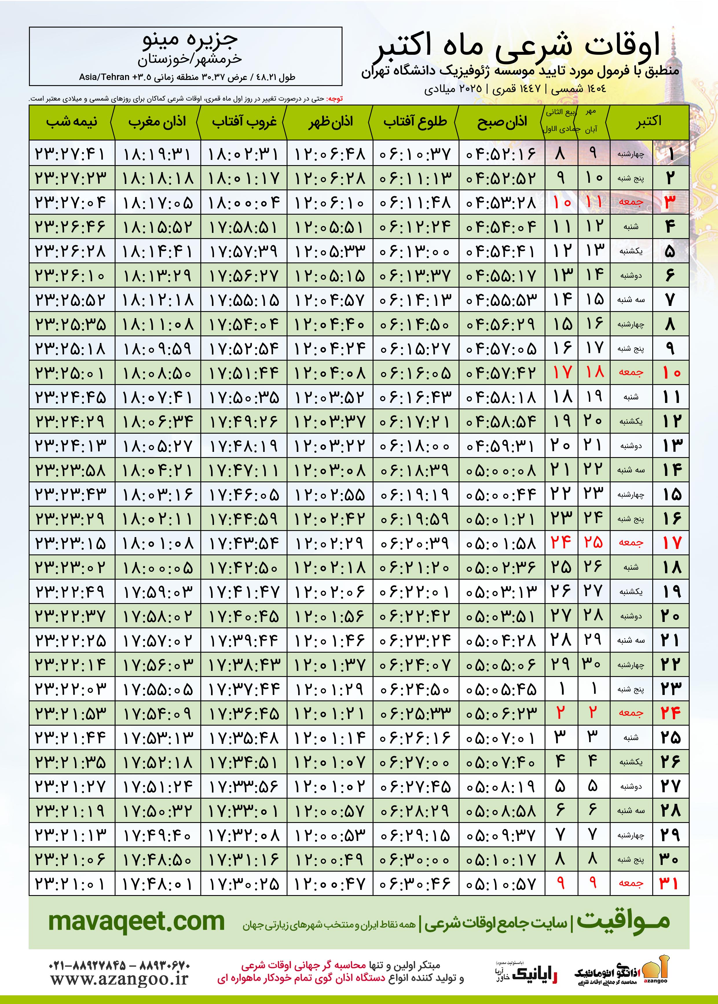 جدول اوقات شرعی مهر ١٤٠٤ شمسی شهر جزیره مینو