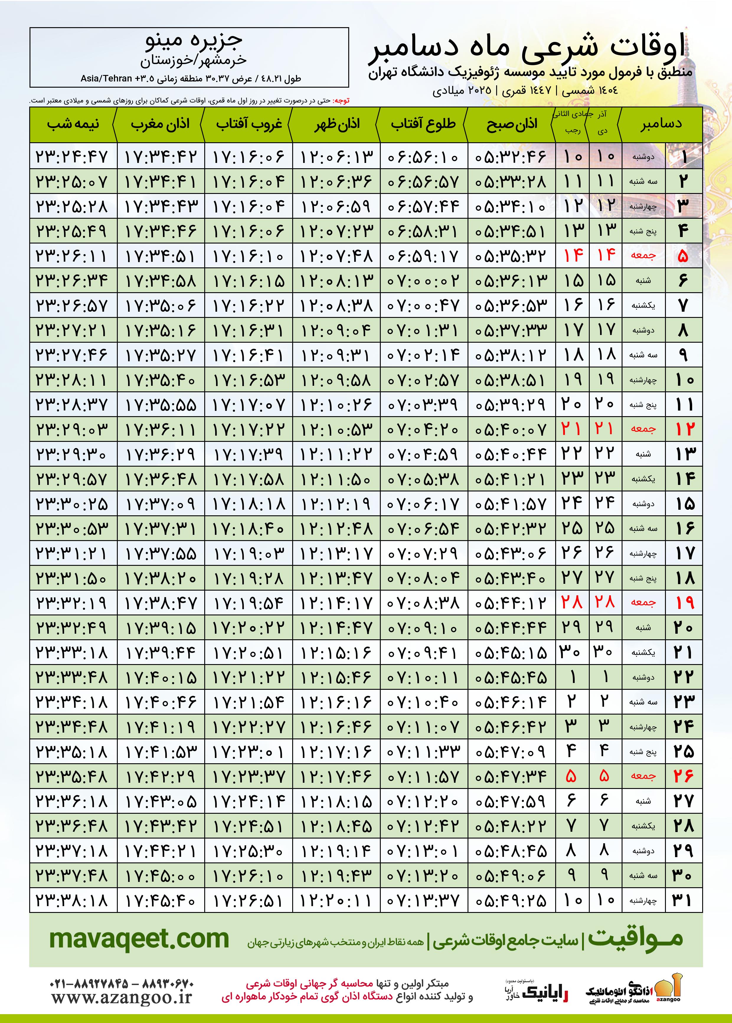 جدول اوقات شرعی آذر ١٤٠٤ شمسی شهر جزیره مینو