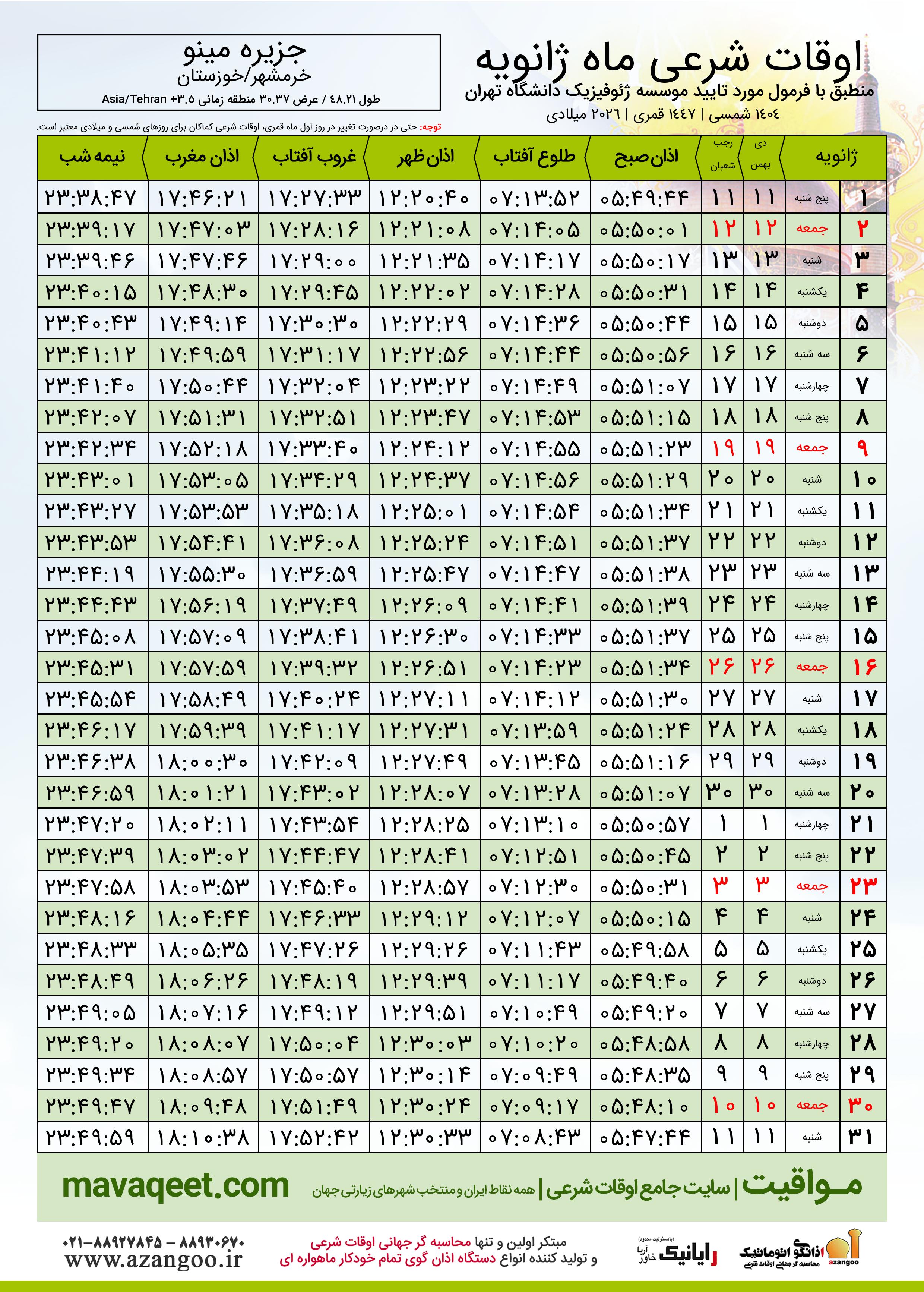 اوقات شرعی ماه شعبان ١٤٤٧ هـ.ق شهر جزیره مینو بر