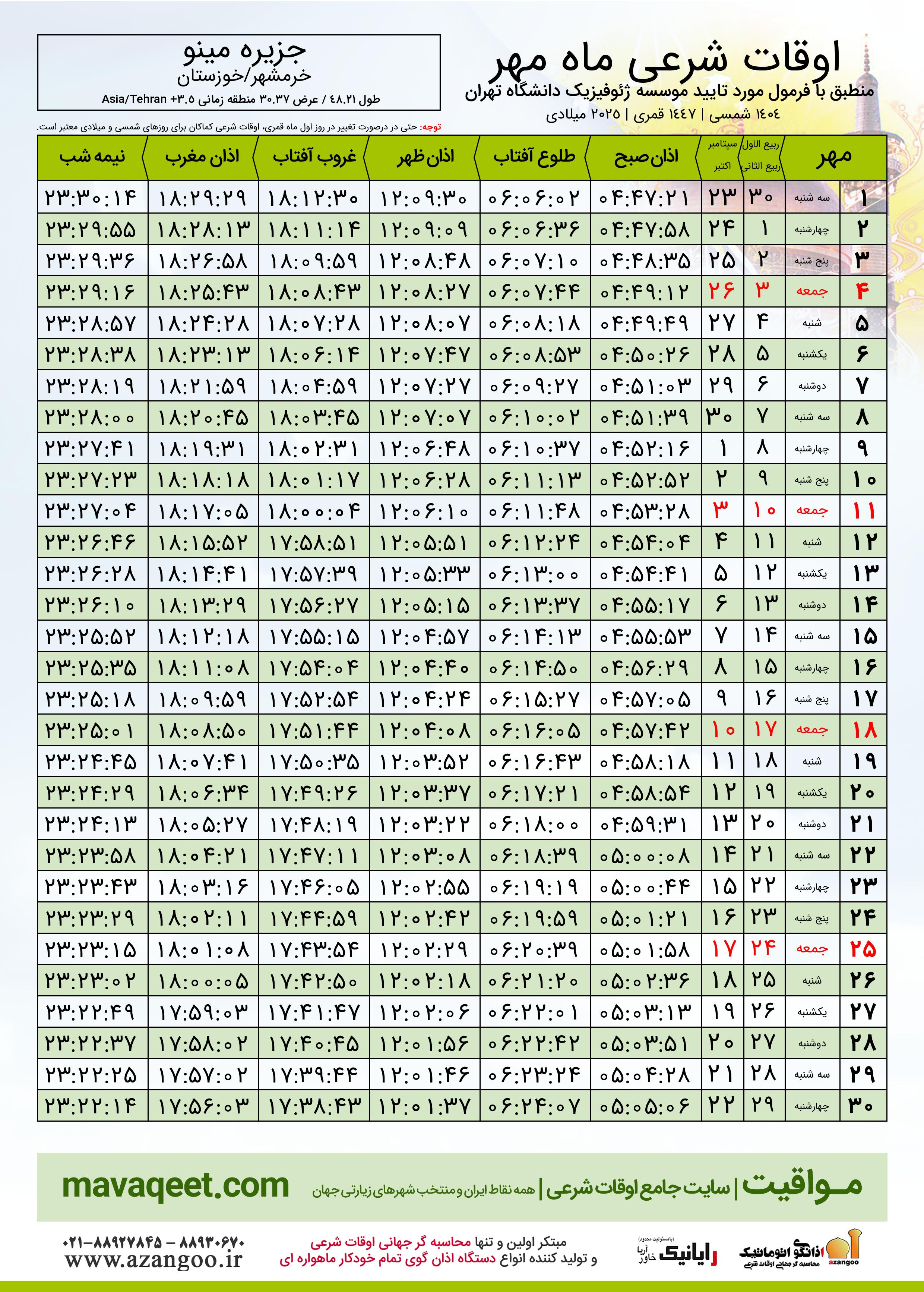 اوقات شرعی مهر ١٤٠٤ شمسی شهر جزیره مینو