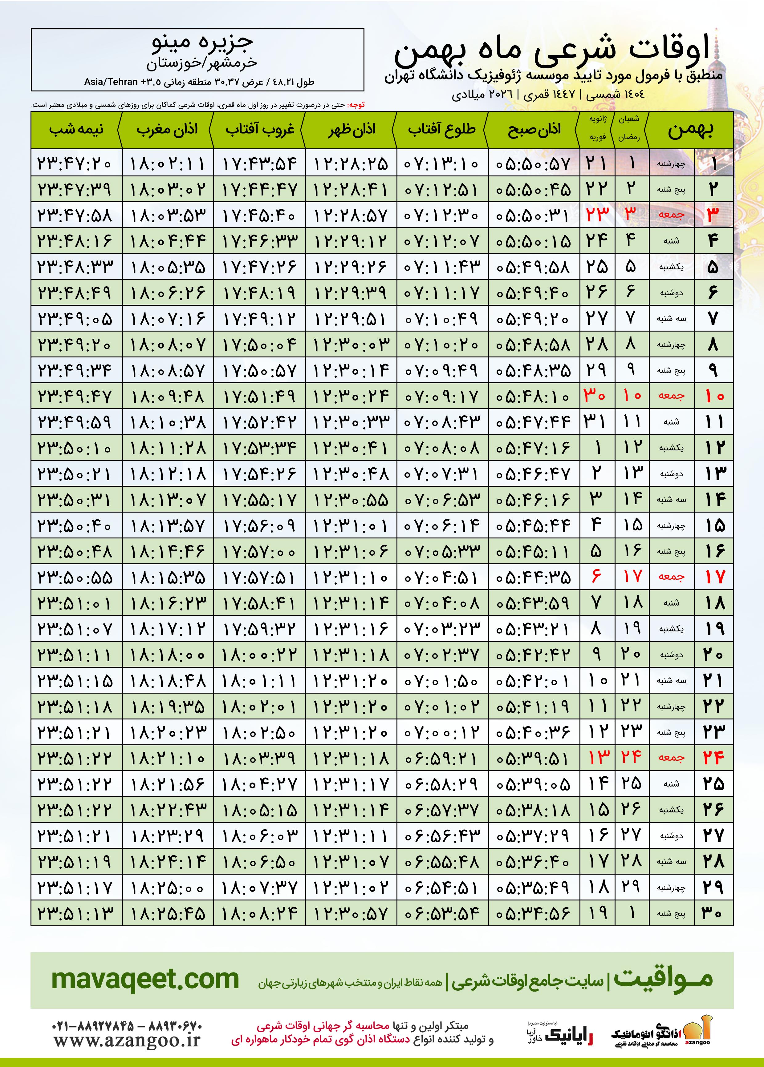 جدول اوقات شرعی بهمن ١٤٠٤ شمسی شهر جزیره مینو