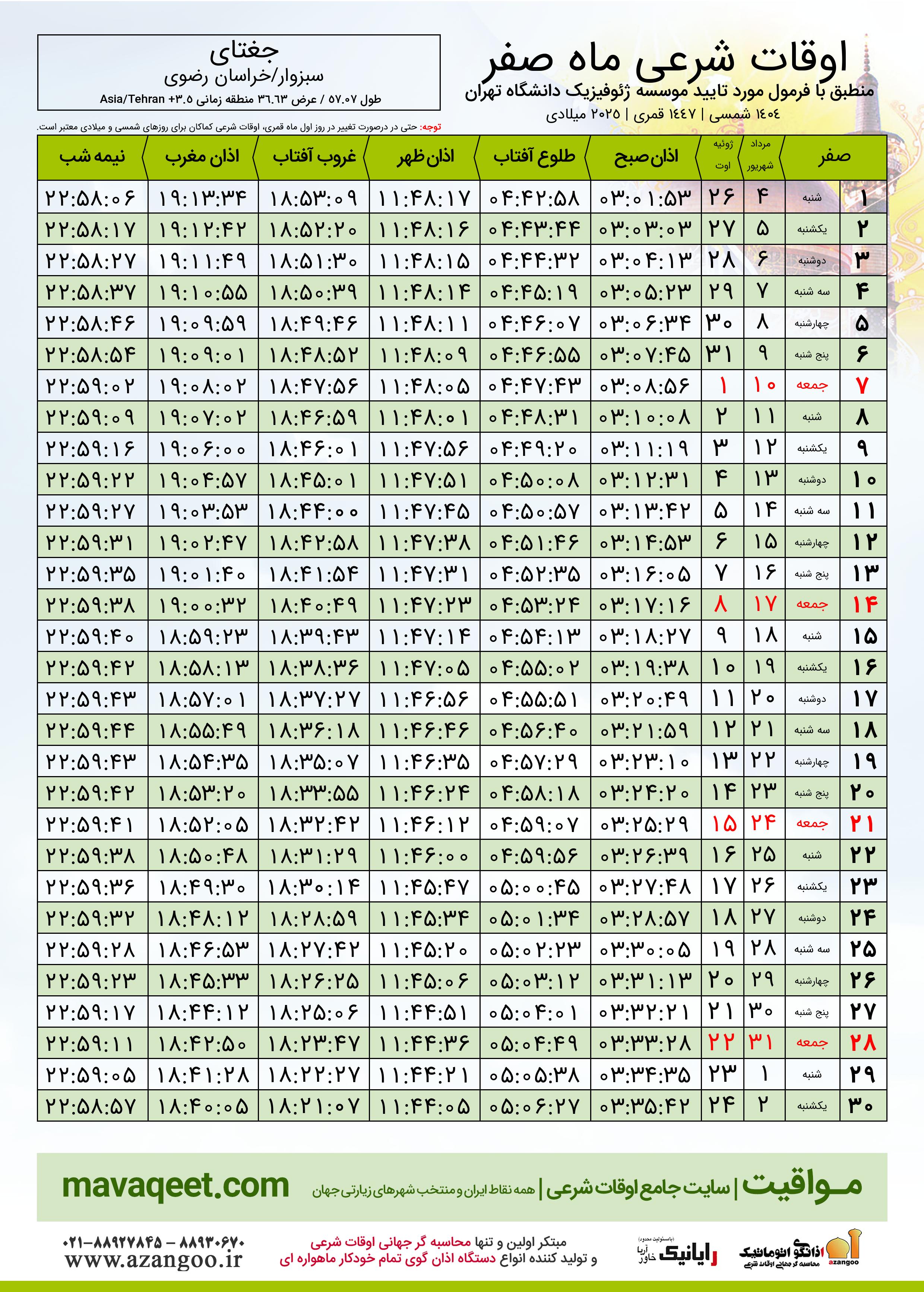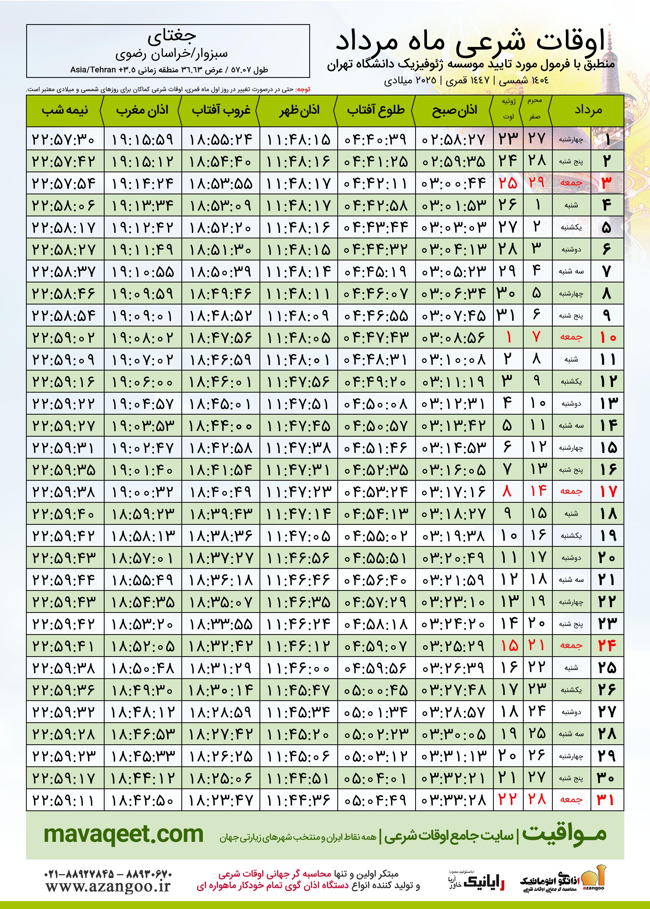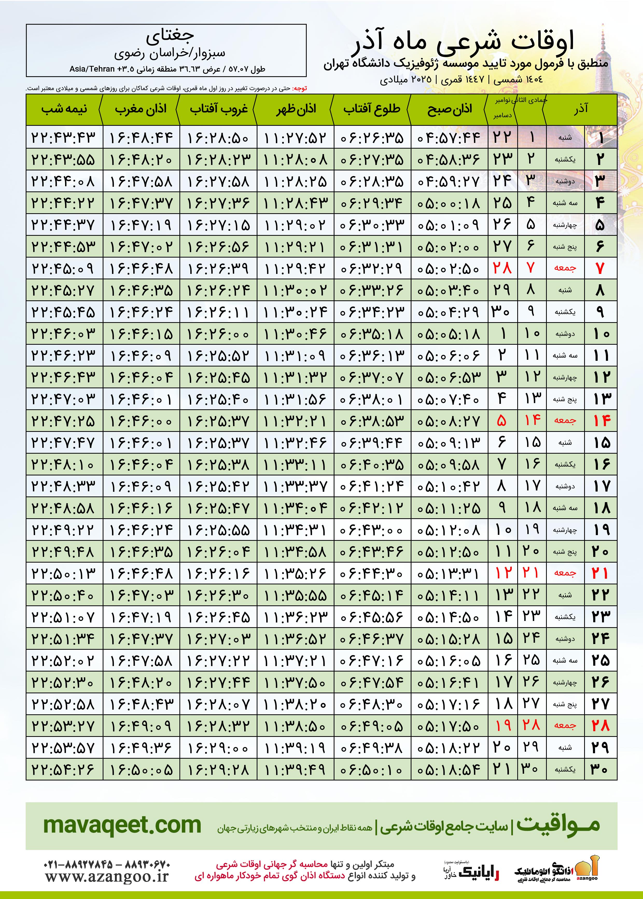 جدول اوقات شرعی آذر ١٤٠٤ شمسی شهر جغتای