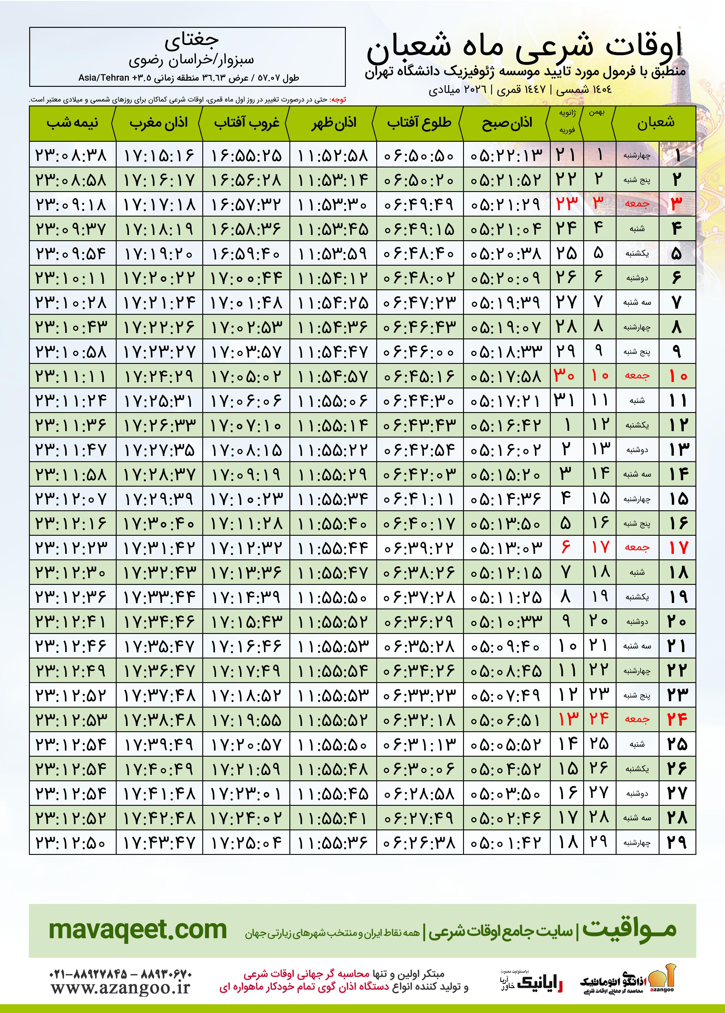 اوقات شرعی ماه شعبان ١٤٤٧ هـ.ق شهر جغتای بر