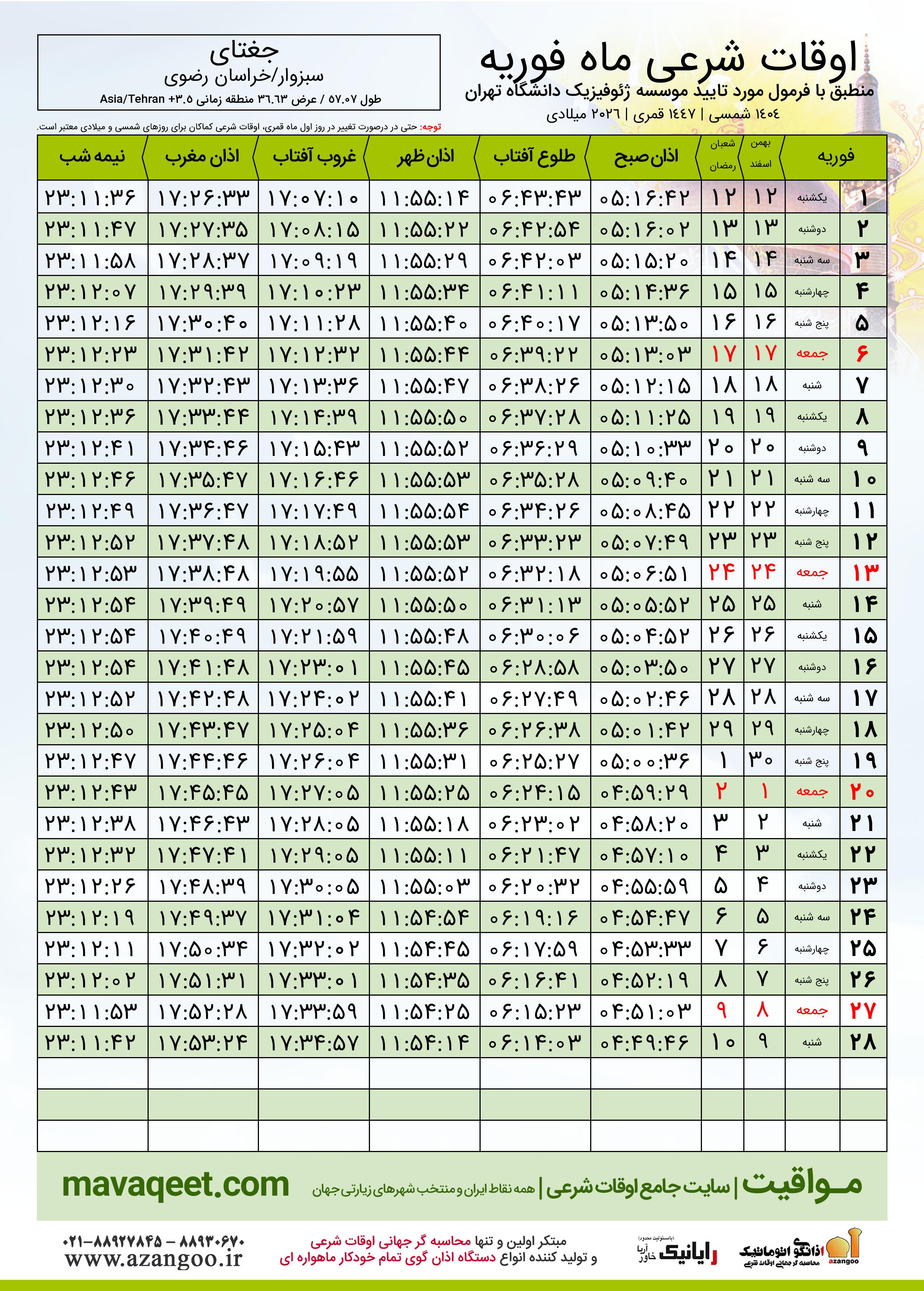 دانلود اوقات شرعی فوریه ٢٠٢٦ شهر جغتای