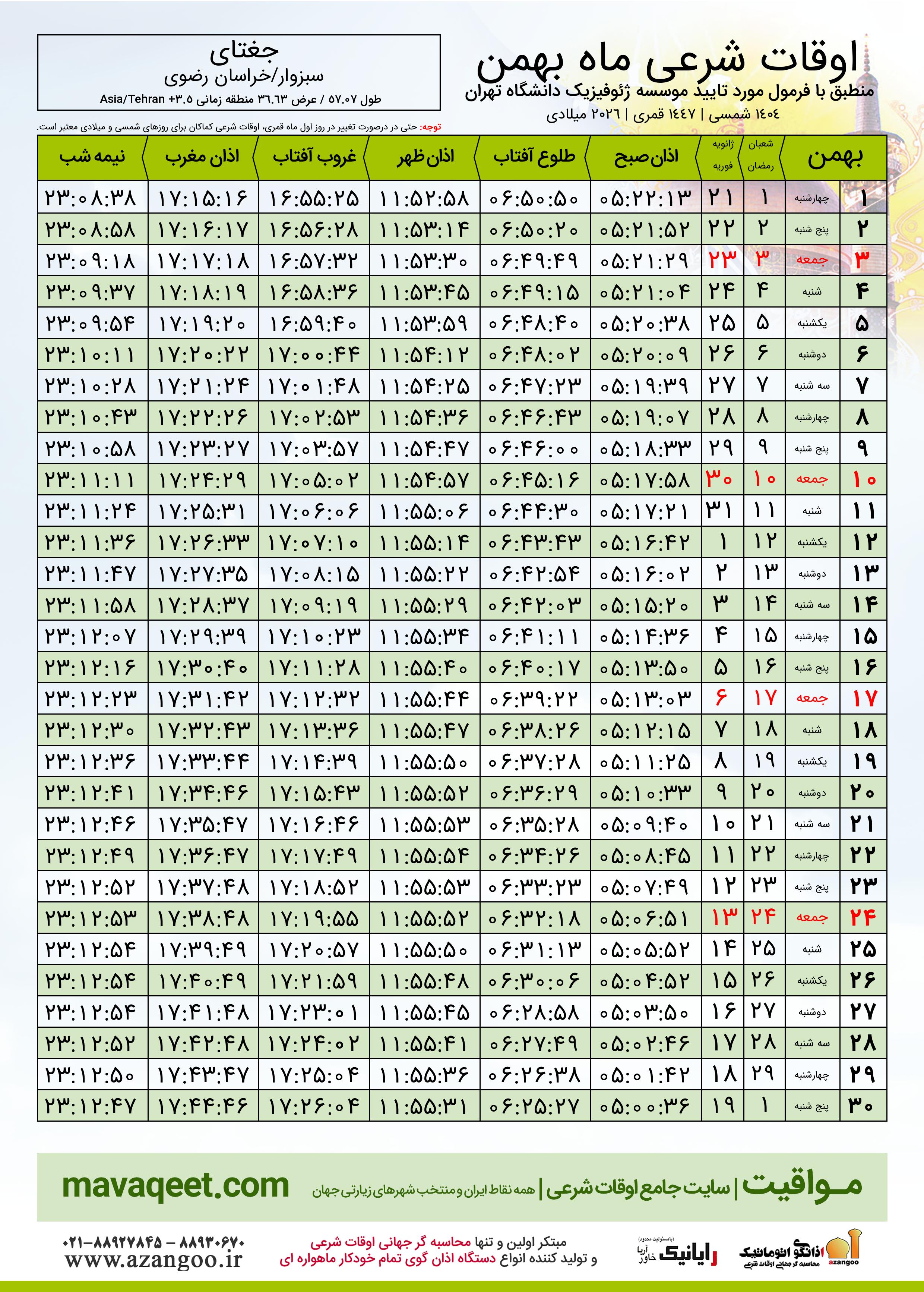 دانلود اوقات شرعی بهمن ٠٤ - ١٤٠٤ شهر جغتای
