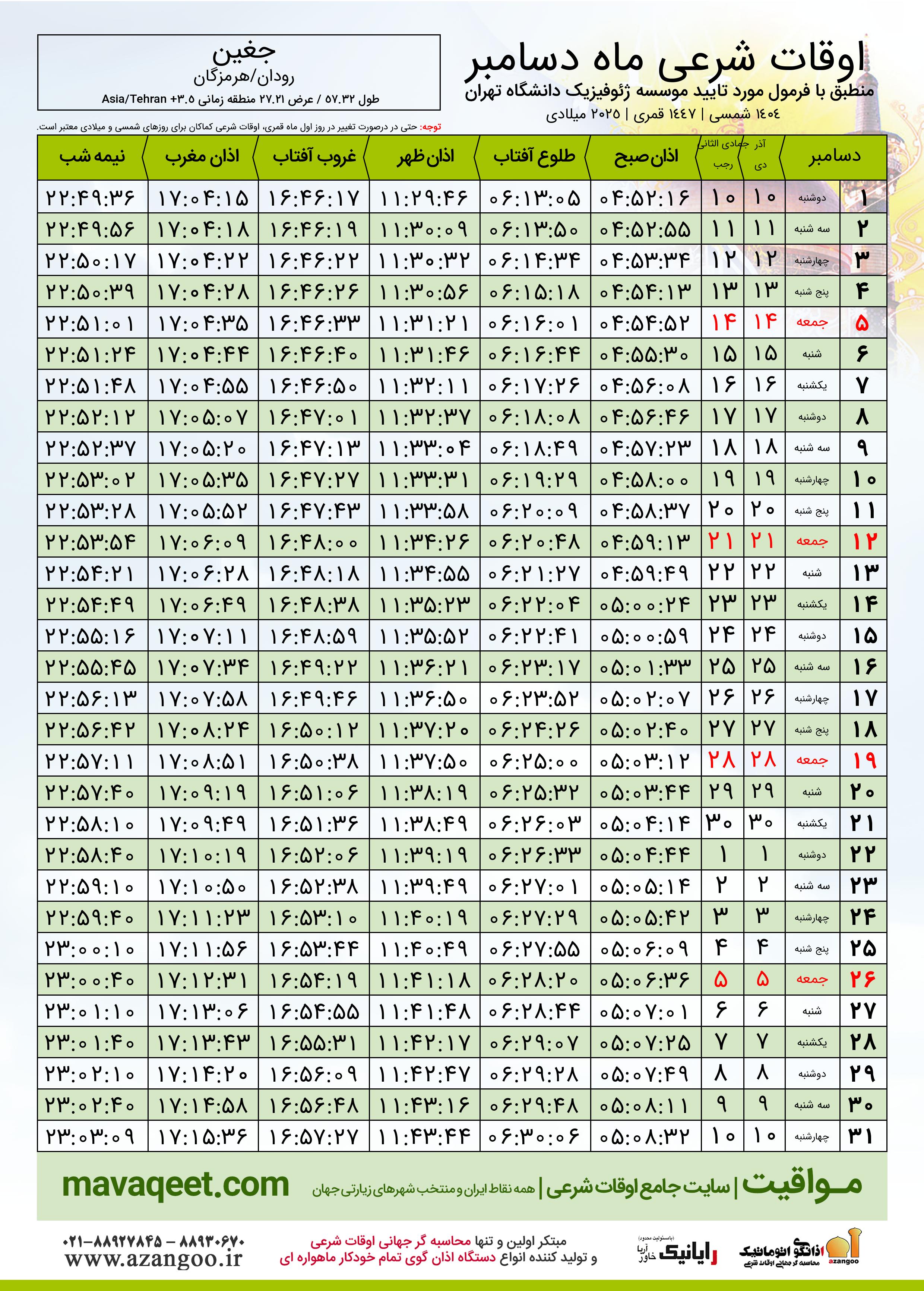 جدول اوقات شرعی دسامبر ٢٠٢٥ میلادی شهر جغین