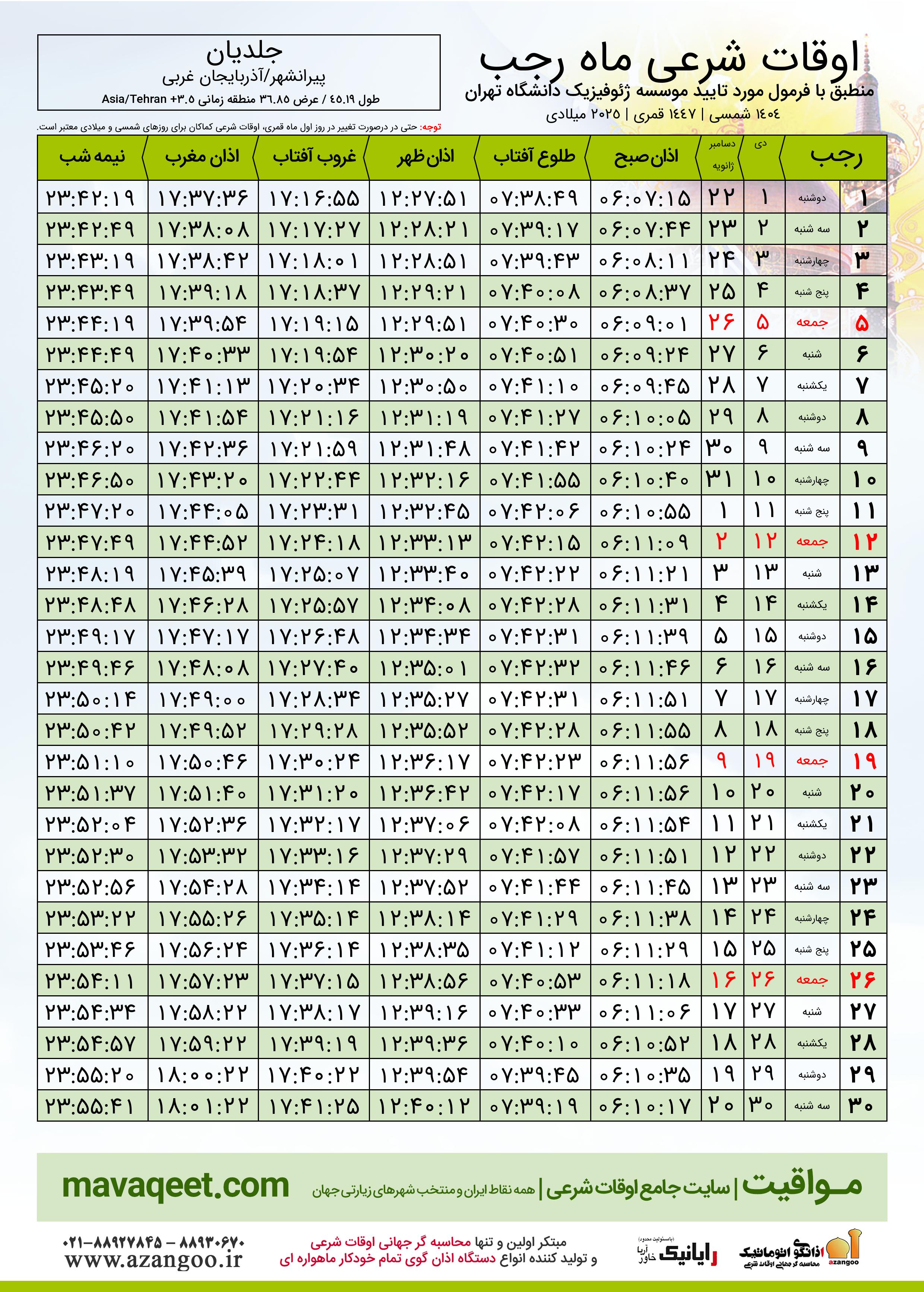 اوقات شرعی ماه رجب ١٤٤٧ هـ.ق شهر جلدیان بر