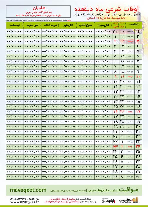 اوقات شرعی دی ١٤٠٤ شمسی شهر جلدیان
