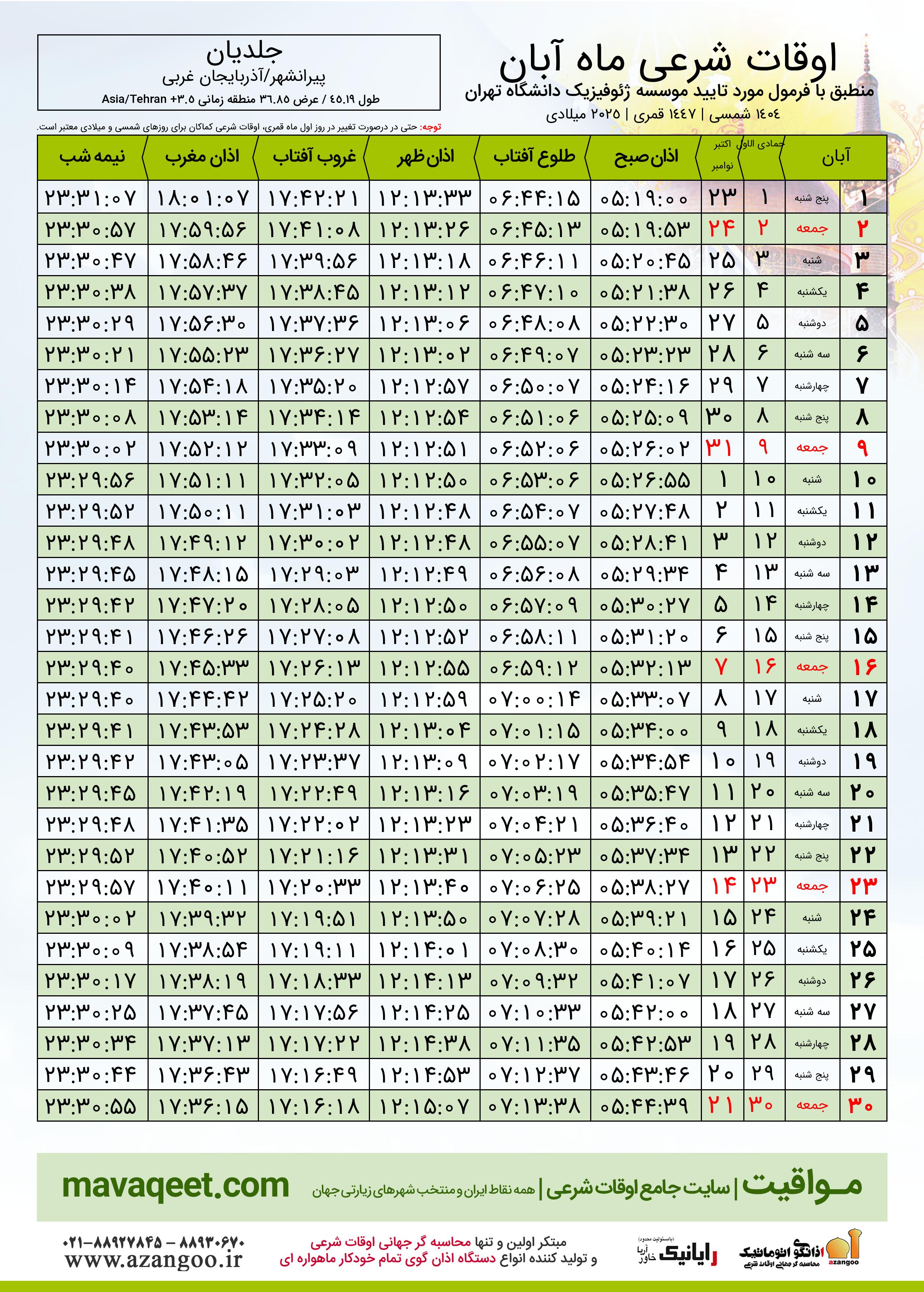 اوقات شرعی آبان ١٤٠٤ شمسی شهر جلدیان