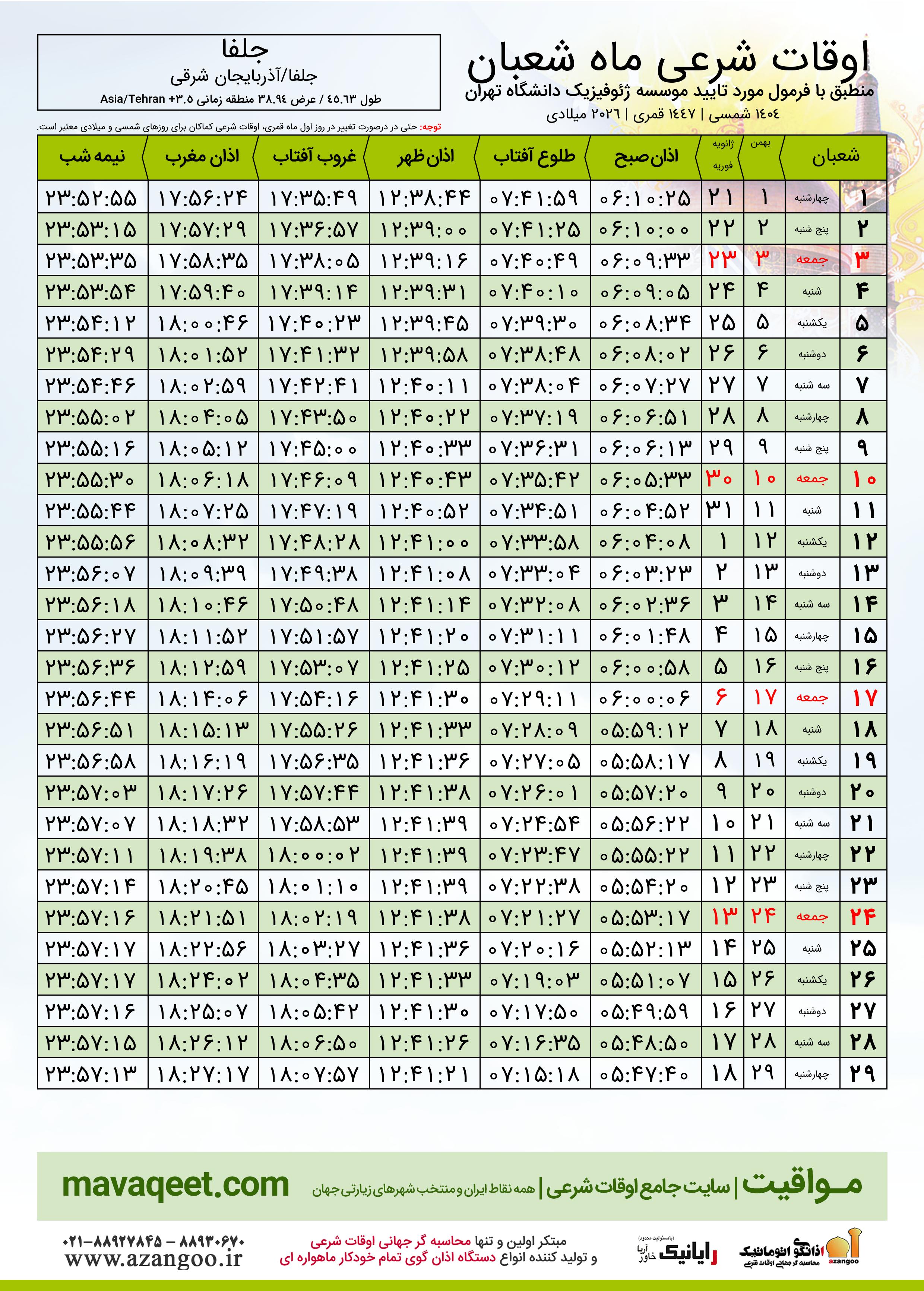 اوقات شرعی ماه شعبان ١٤٤٧ هـ.ق شهر جلفا بر
