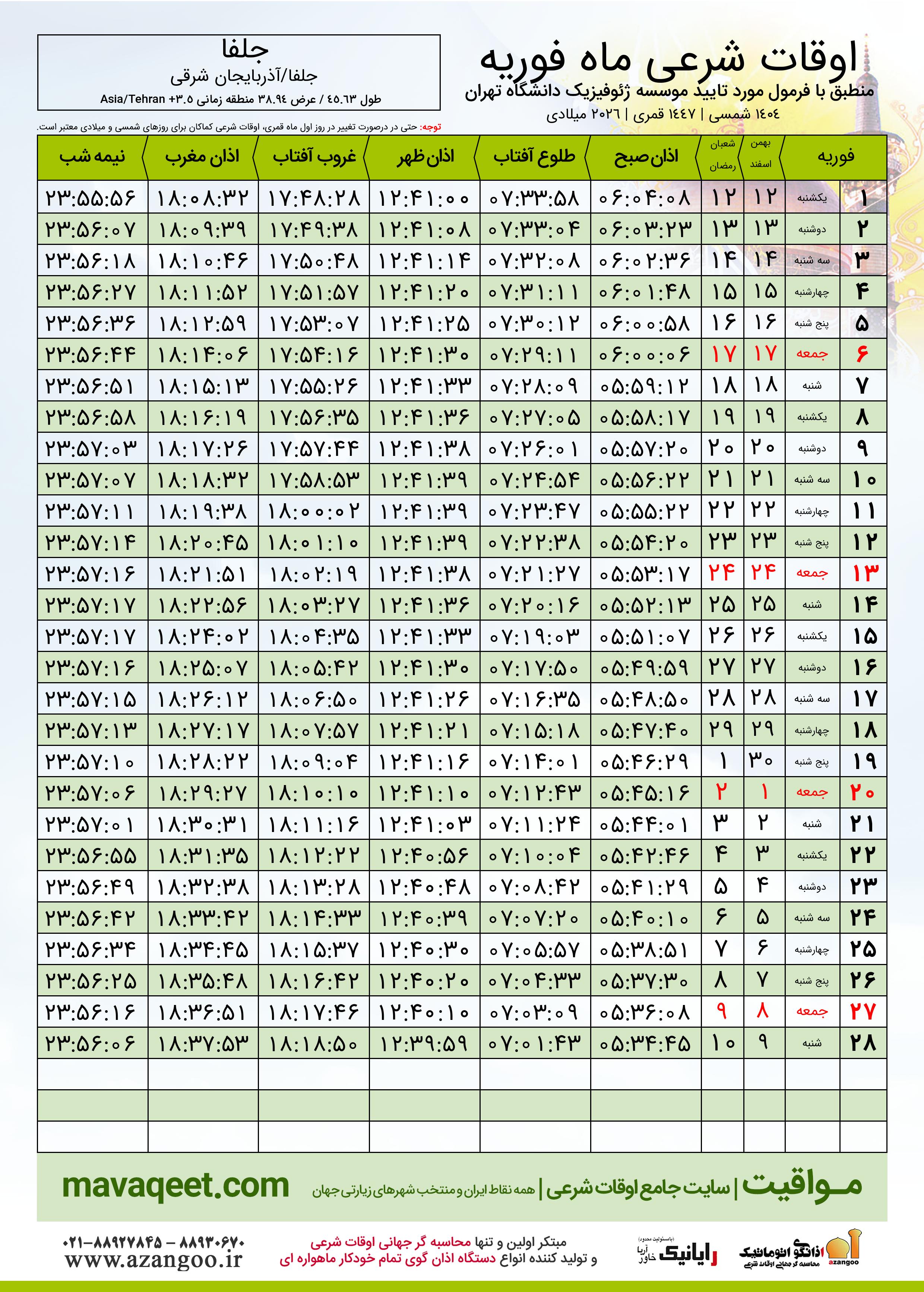 دانلود اوقات شرعی ماه رمضان ٠٤ - ١٤٠٤ شمسی | ٢٠٢٦ میلادی | ١٤٤٧ قمری شهر جلفا
