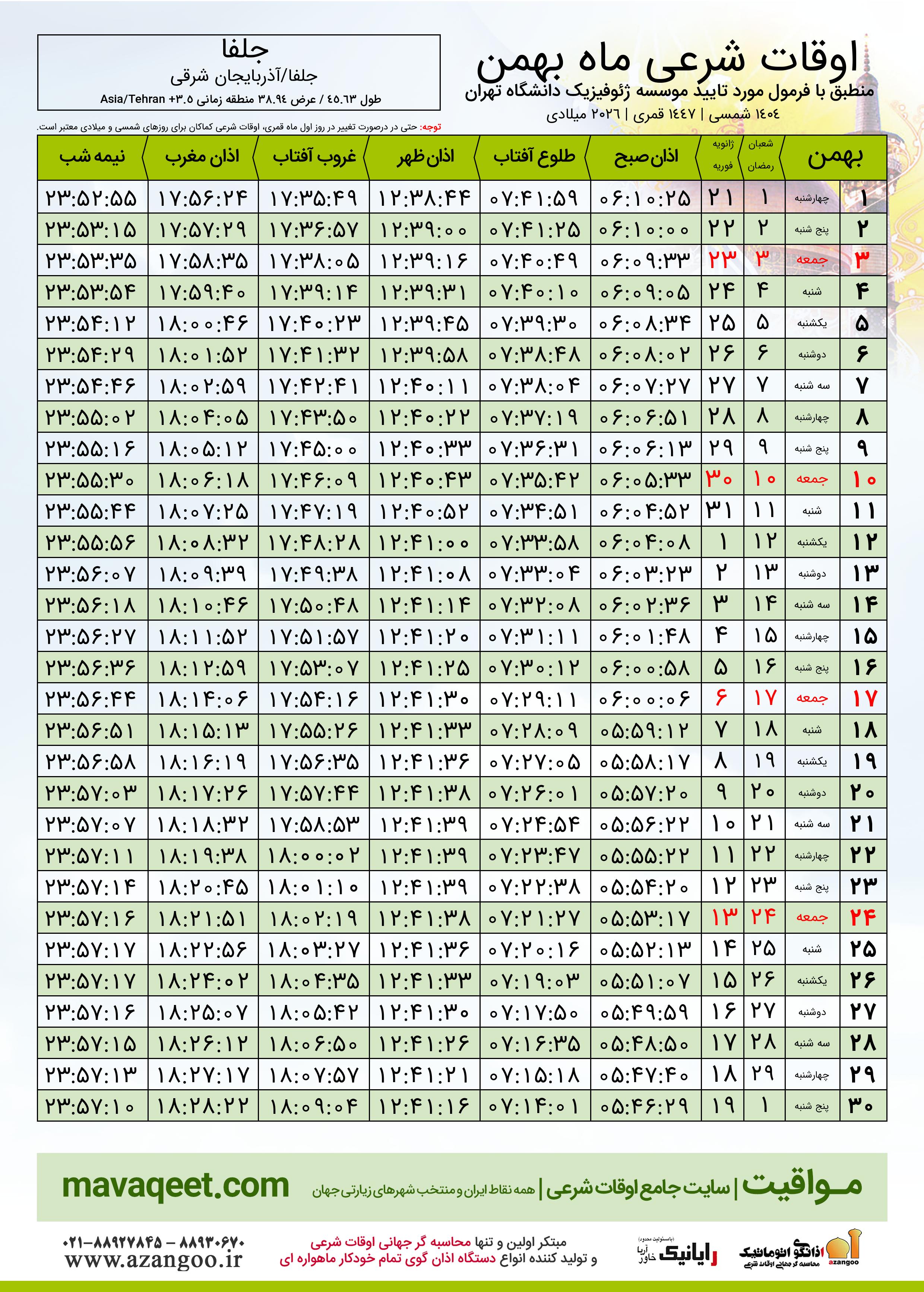 دانلود اوقات شرعی بهمن ٠٤ - ١٤٠٤ شهر جلفا