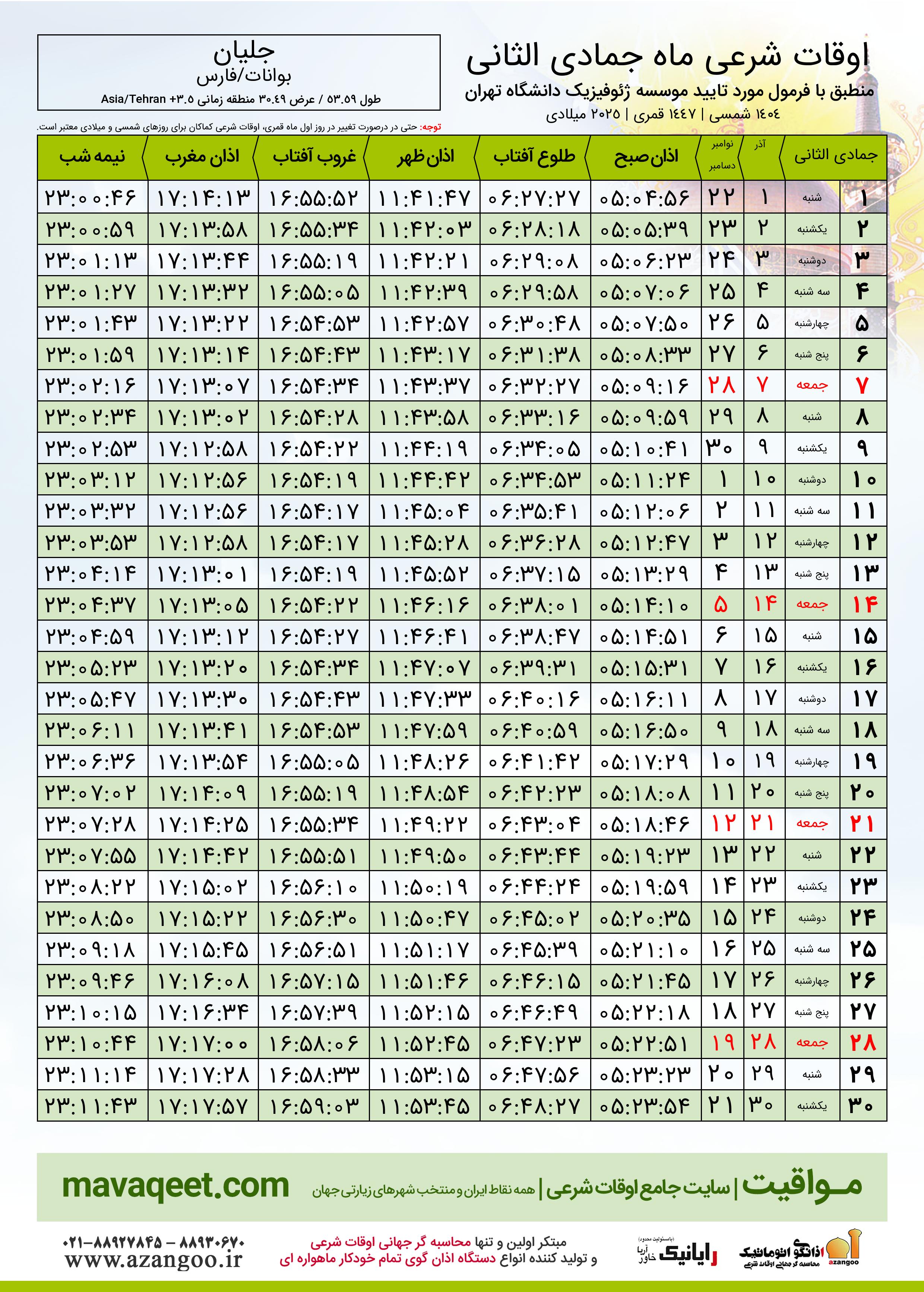 اوقات شرعی ماه جمادی الثانی ١٤٤٧ هـ.ق شهر جلیان بر