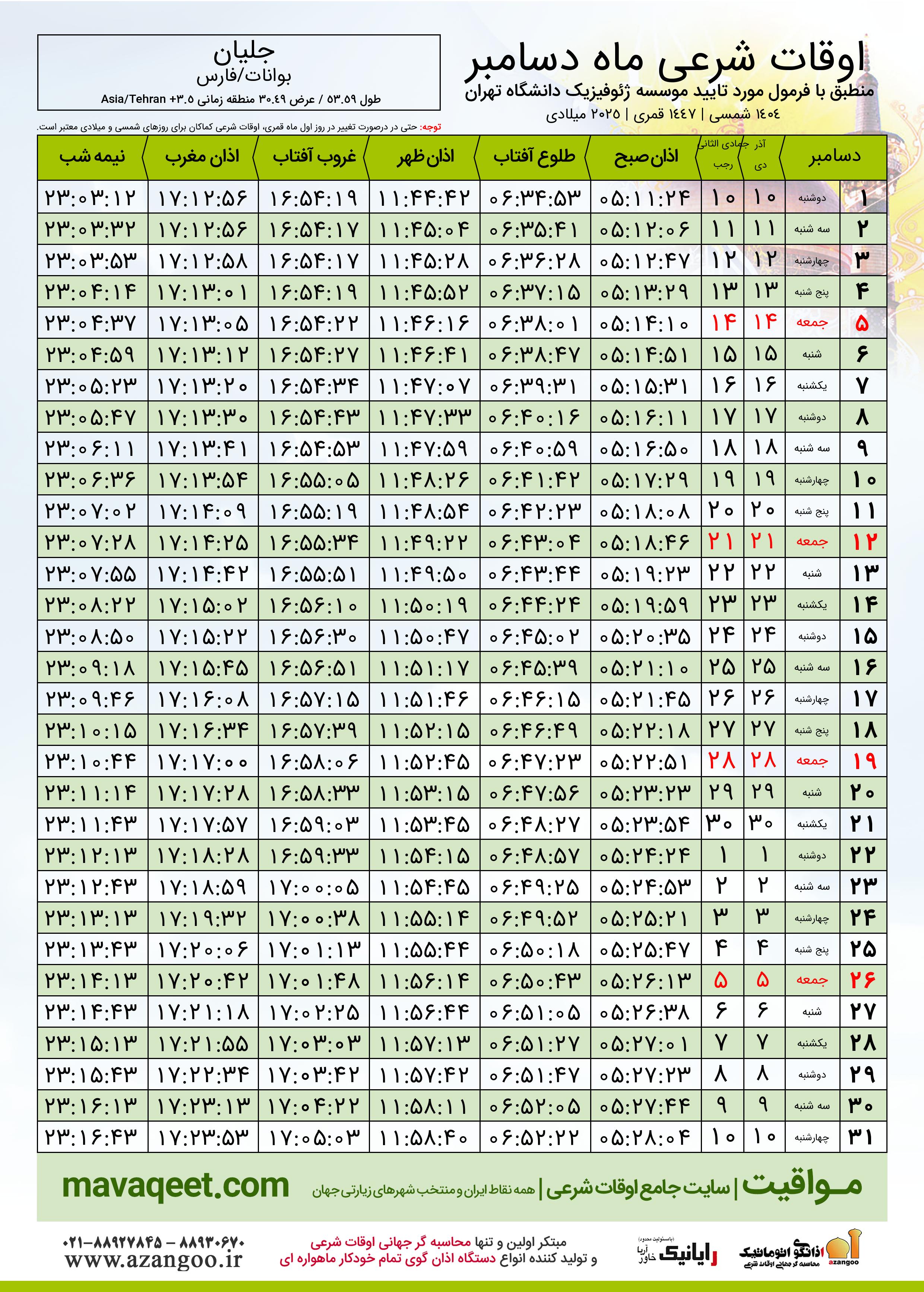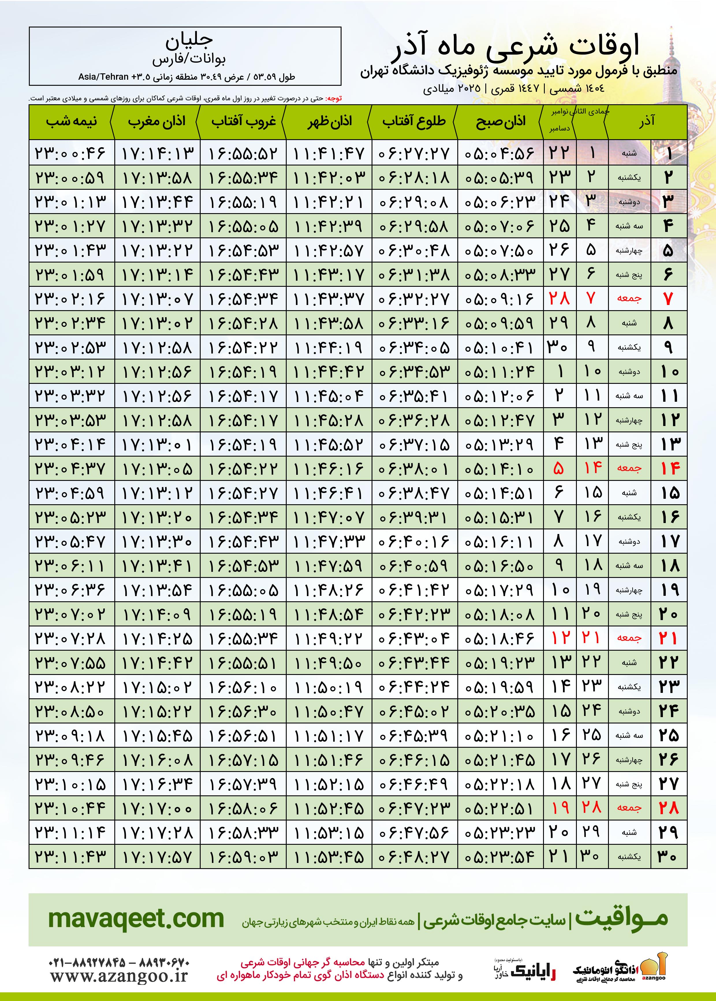 جدول اوقات شرعی آذر ١٤٠٤ شمسی شهر جلیان