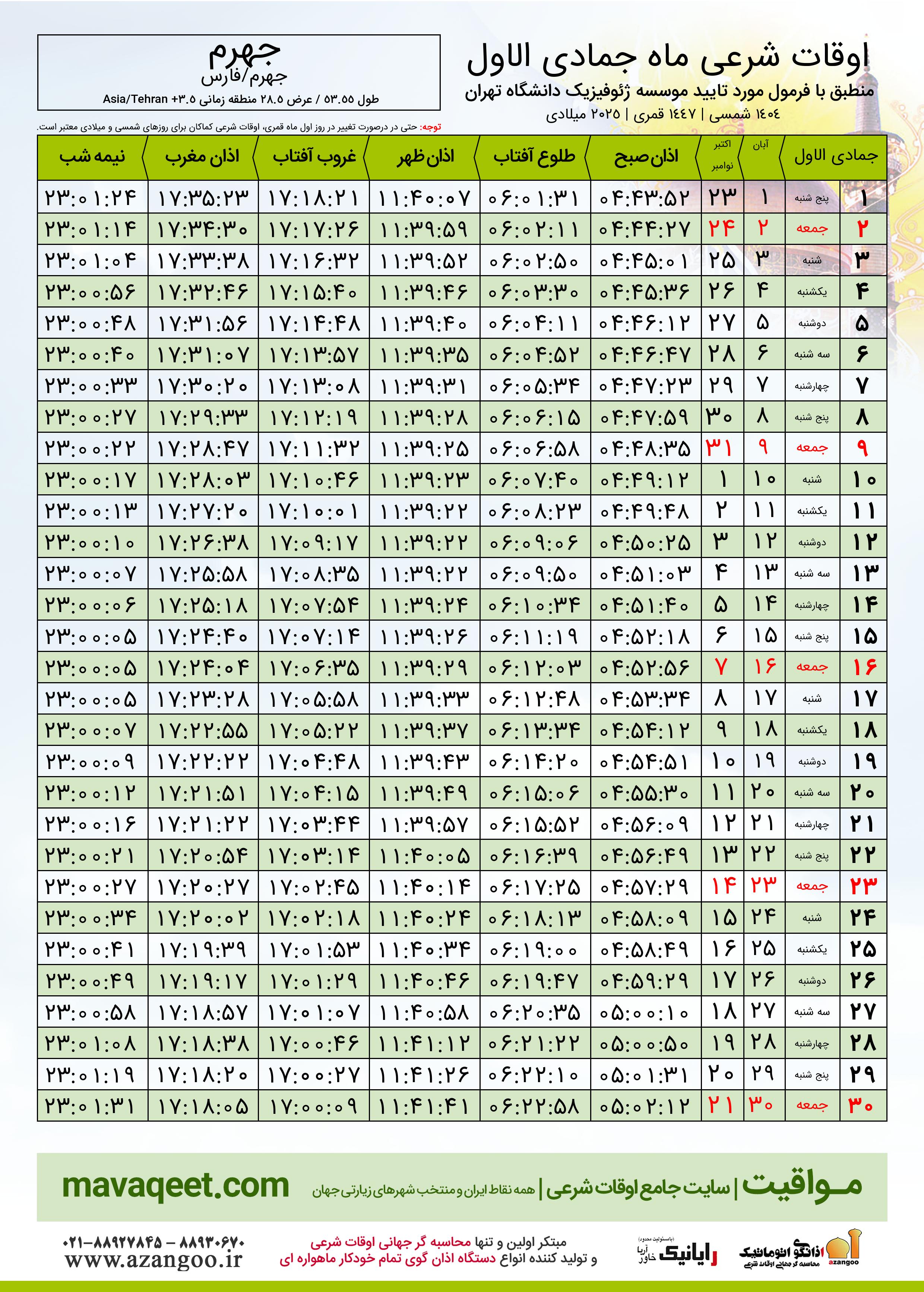 جدول اوقات شرعی جمادی الاول ١٤٤٧ قمری شهر جهرم
