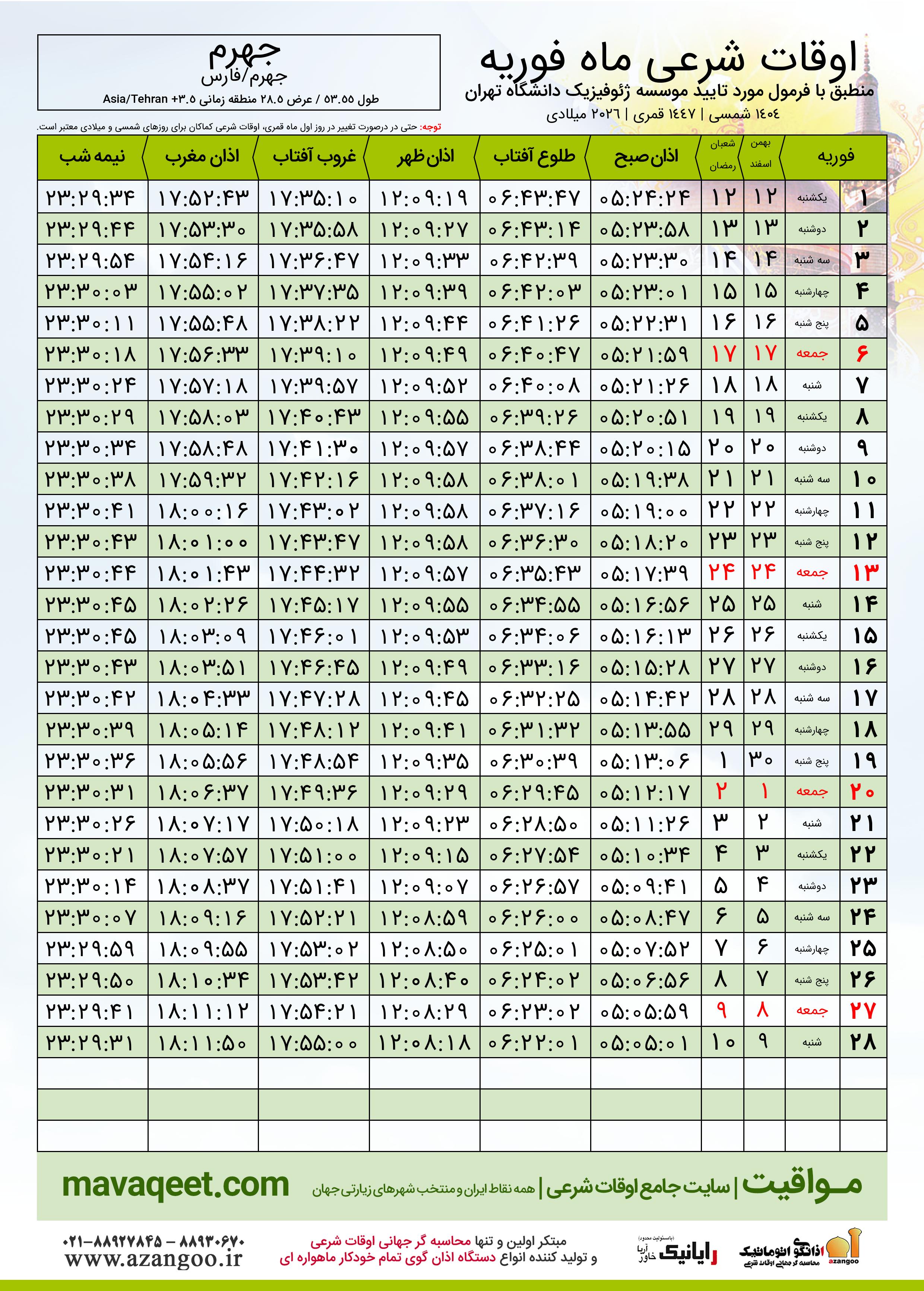 جدول اوقات شرعی ماه رمضان شهر جهرم ٠٤ - ١٤٠٤ شمسی | ٢٠٢٦ میلادی | ١٤٤٧ قمری
