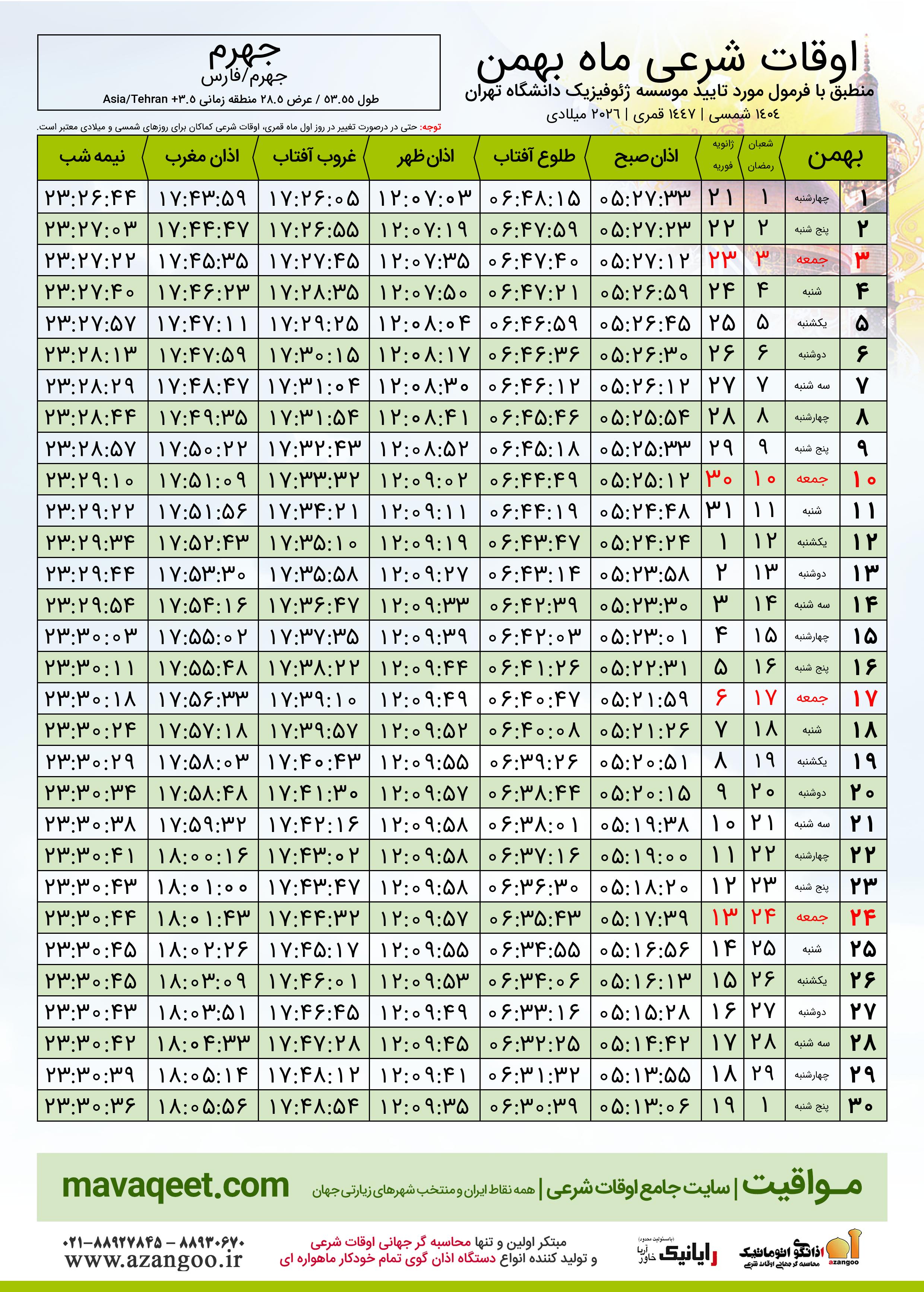 دانلود اوقات شرعی بهمن ٠٤ - ١٤٠٤ شهر جهرم