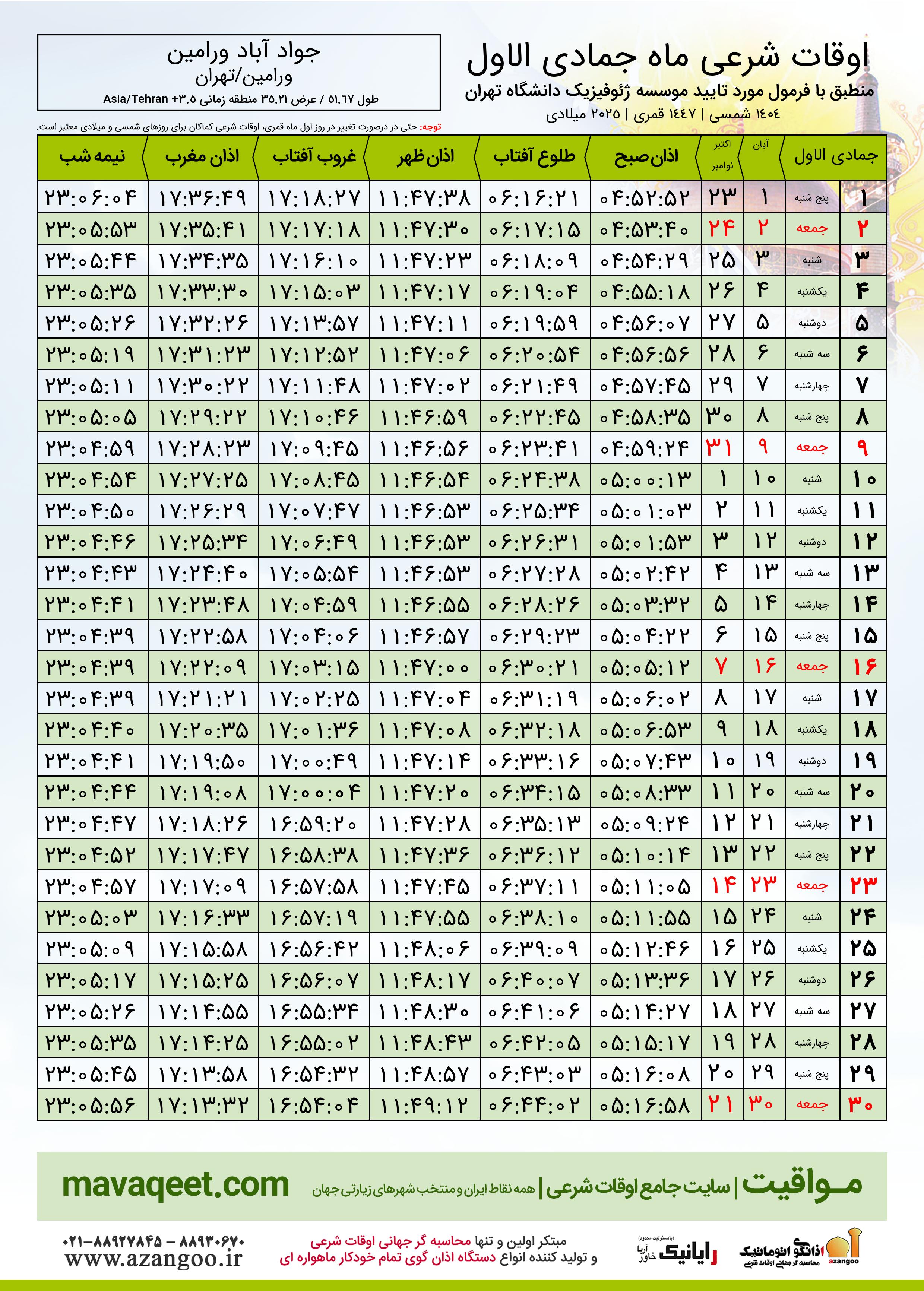 اوقات شرعی ماه جمادی الاول ١٤٤٧ هـ.ق شهر جواد آباد ورامین بر