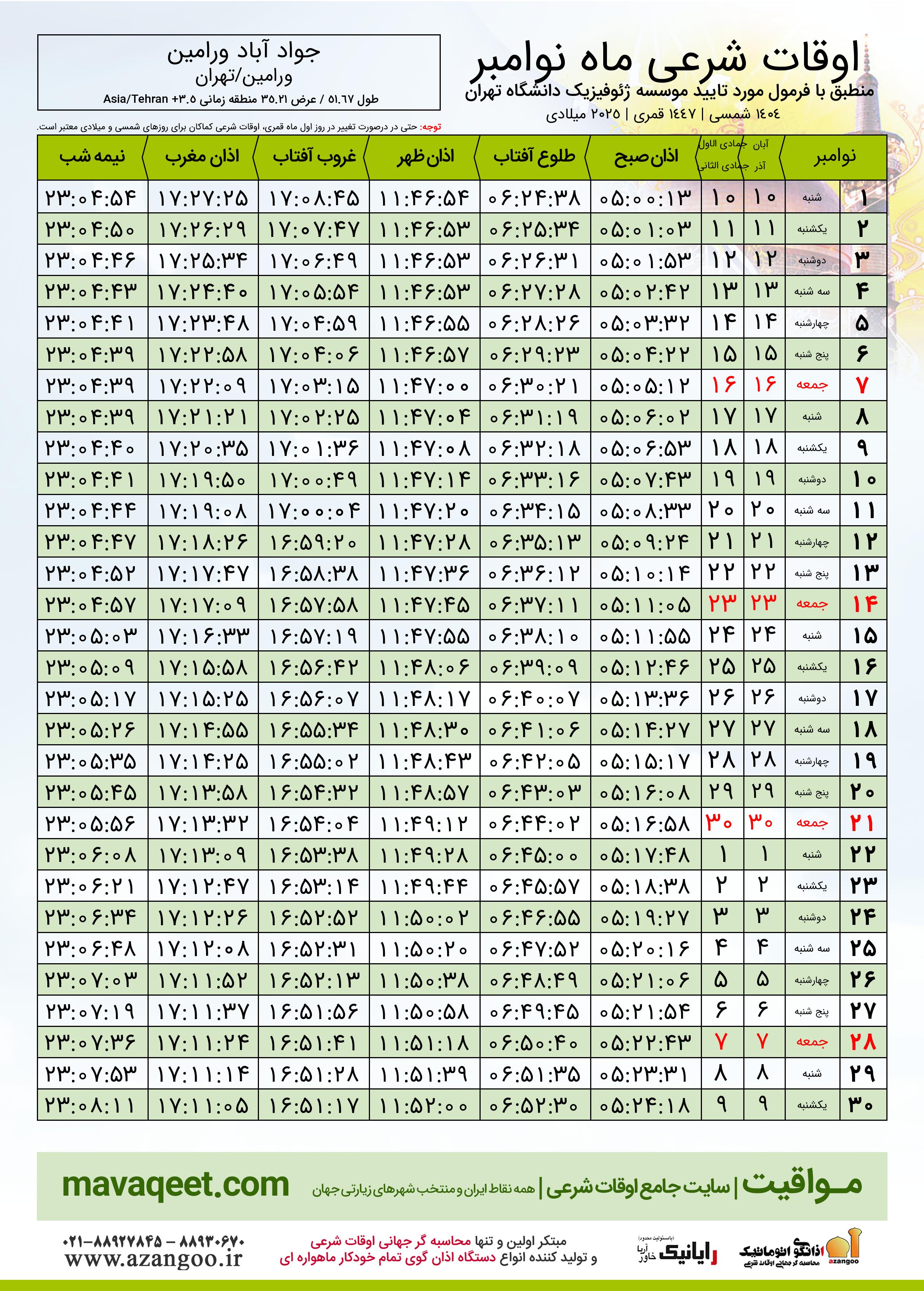 اوقات شرعی نوامبر ٢٠٢٥ میلادی شهر جواد آباد ورامین