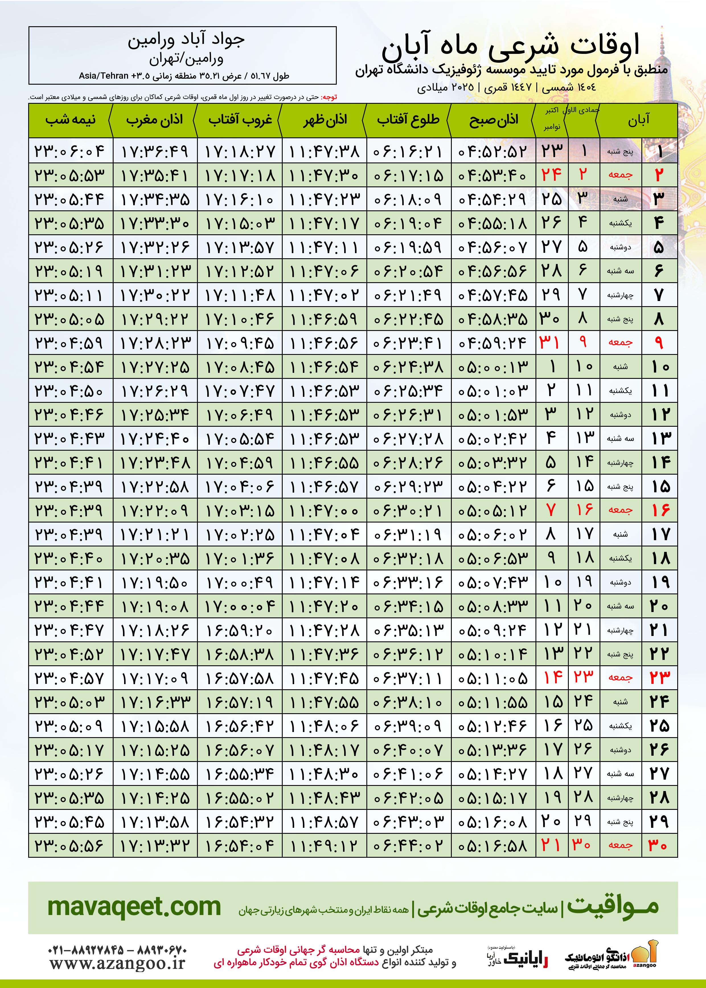 اوقات شرعی آبان ١٤٠٤ شمسی شهر جواد آباد ورامین