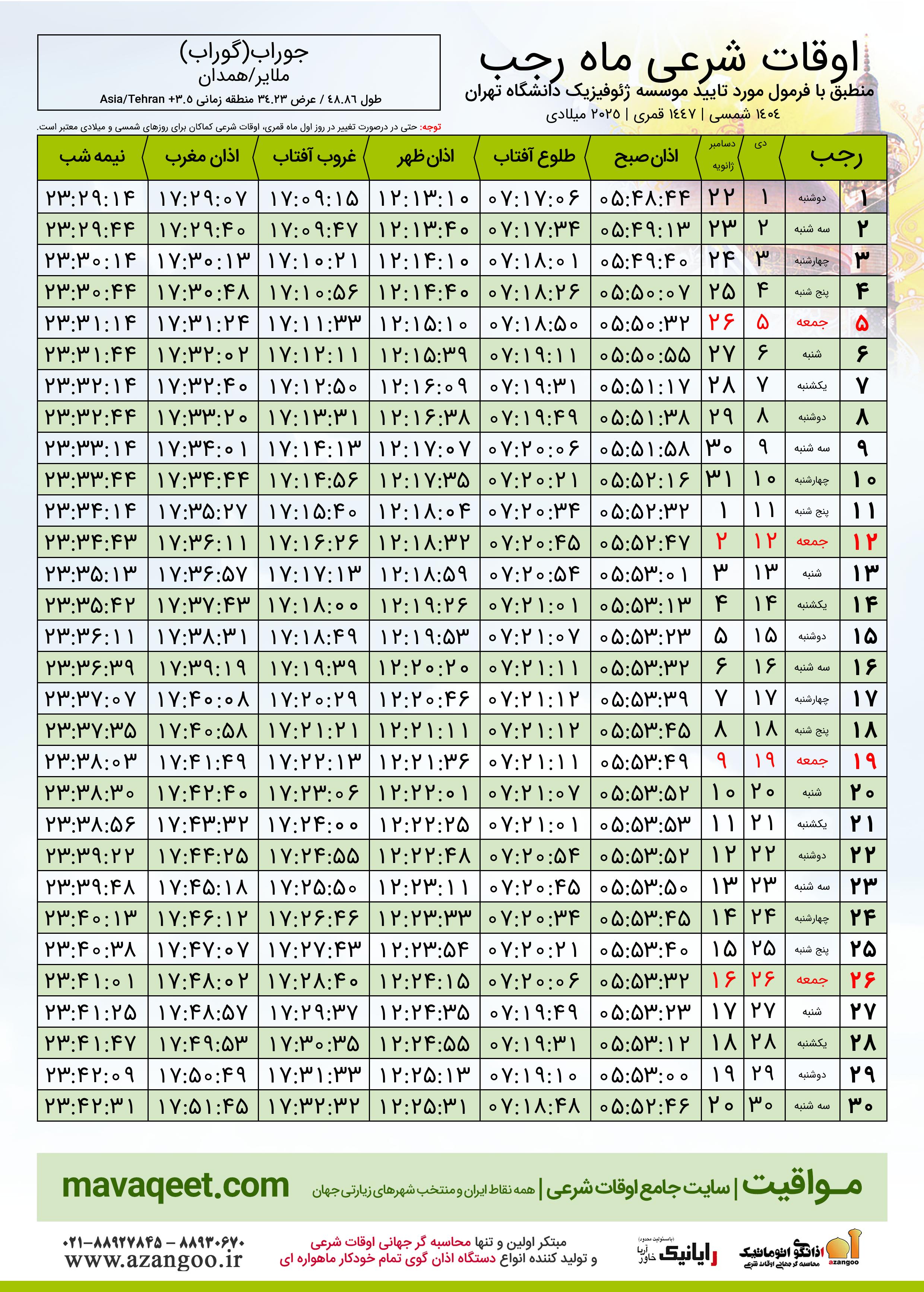 اوقات شرعی ماه رجب ١٤٤٧ هـ.ق شهر جوراب(گوراب) بر