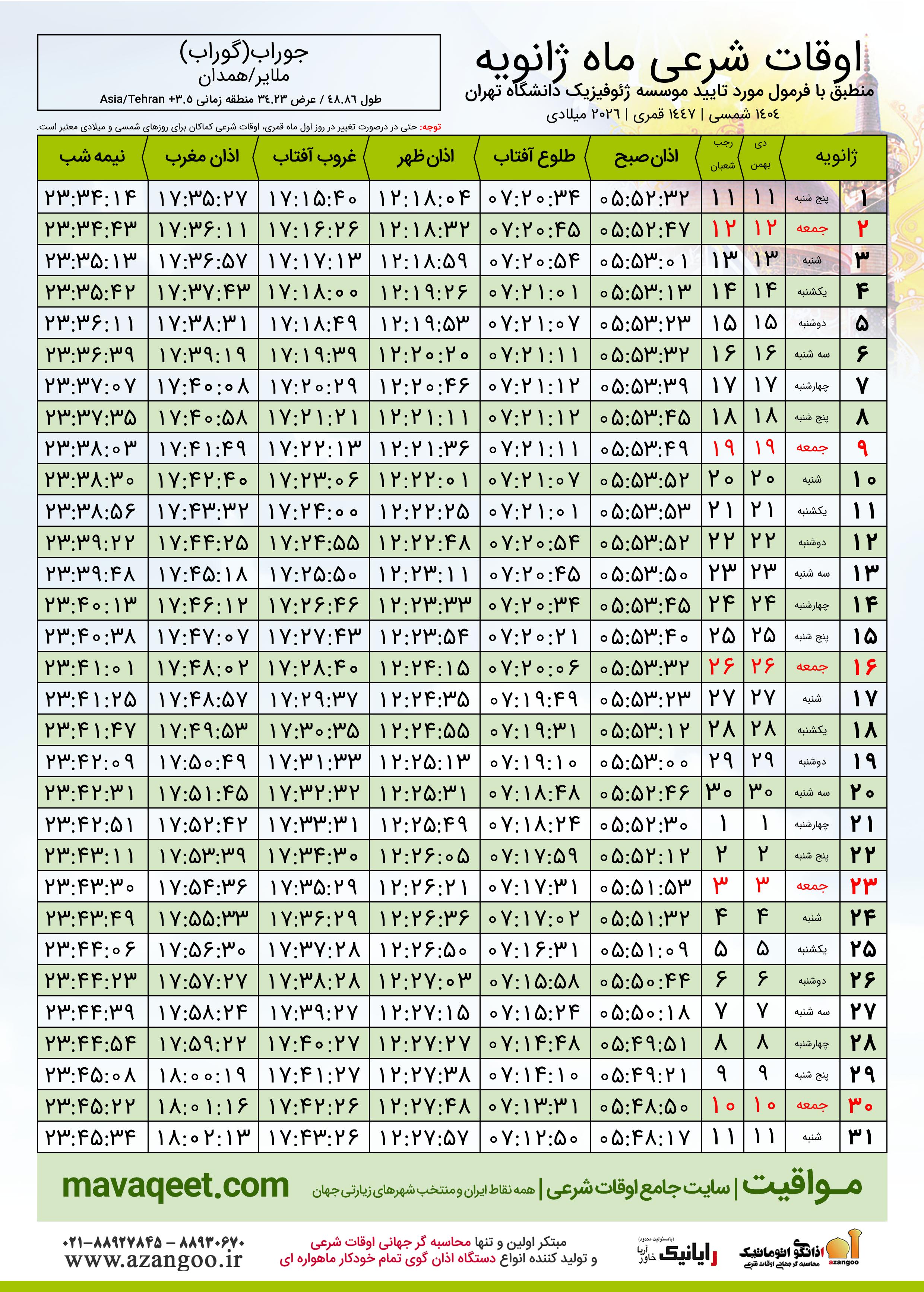 دانلود اوقات شرعی ژانویه ٢٠٢٦ شهر جوراب(گوراب)