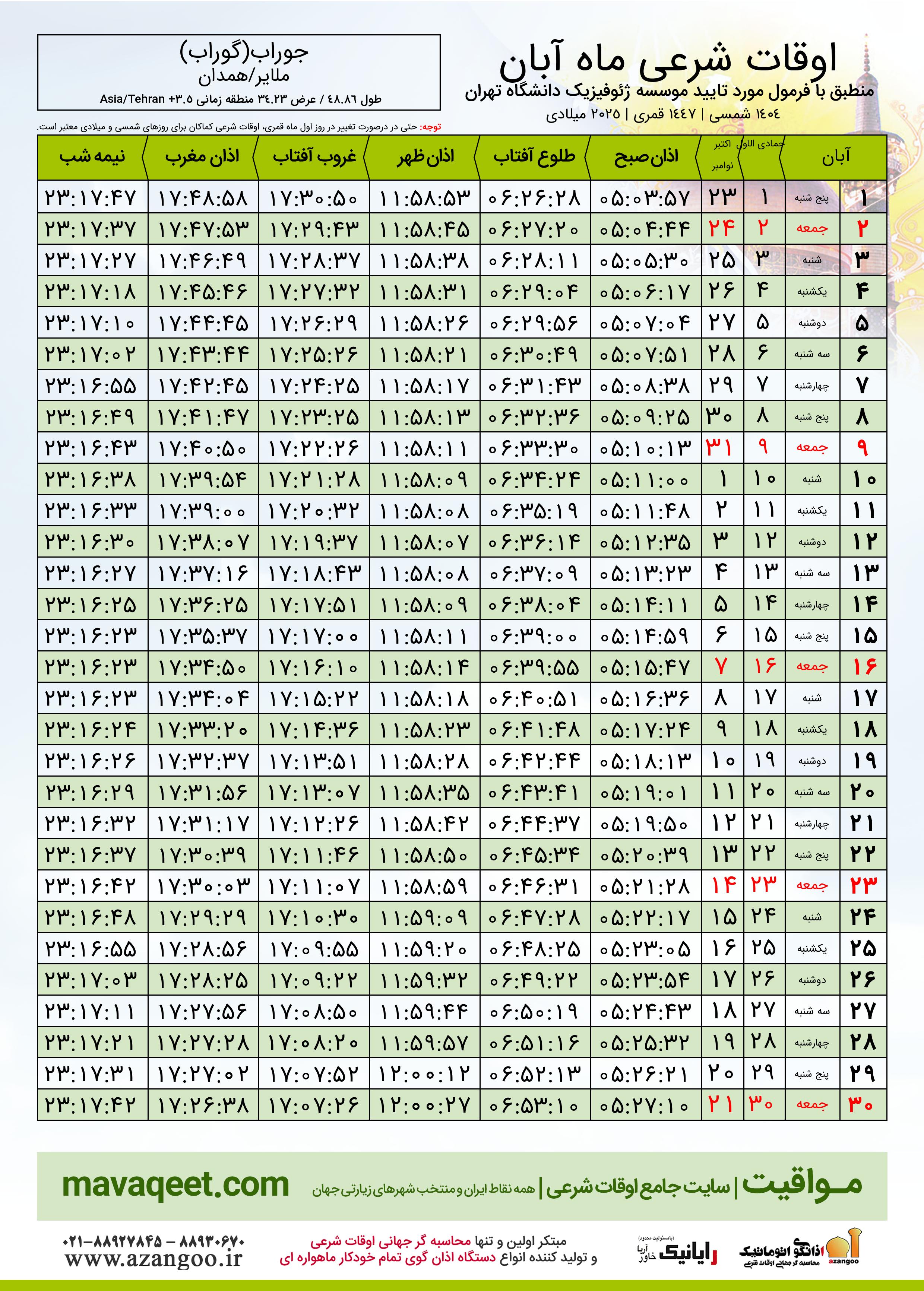 اوقات شرعی آبان ١٤٠٤ شمسی شهر جوراب(گوراب)