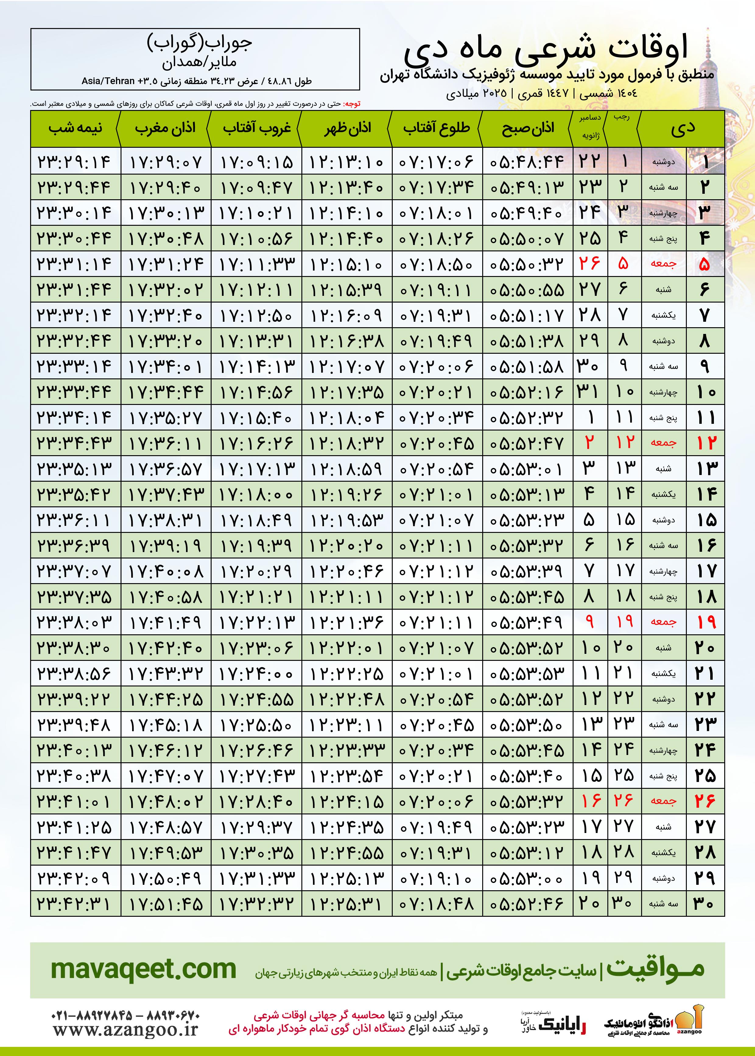 اوقات شرعی دی ١٤٠٤ شمسی شهر جوراب(گوراب)