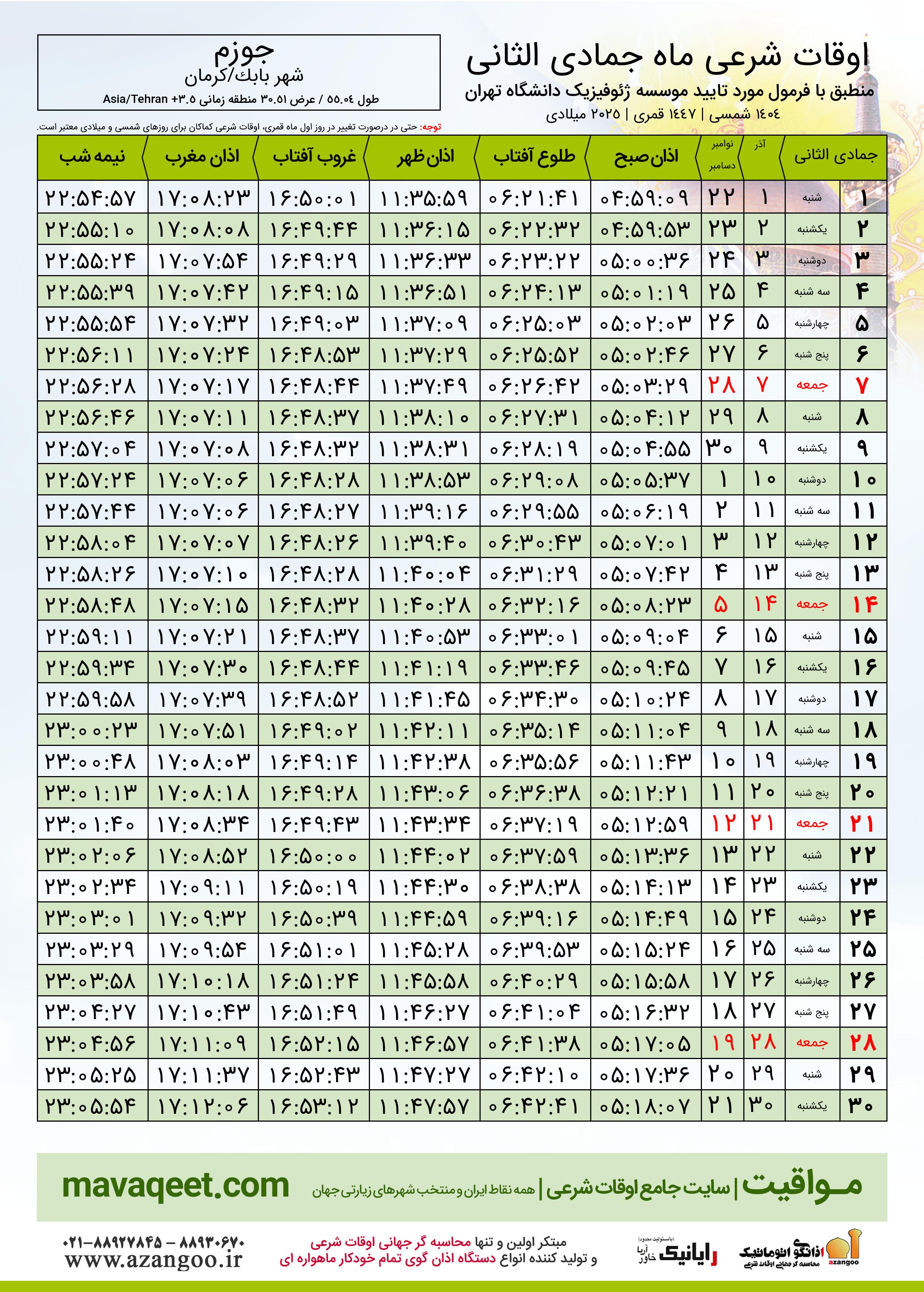 اوقات شرعی ماه جمادی الثانی ١٤٤٧ هـ.ق شهر جوزم بر