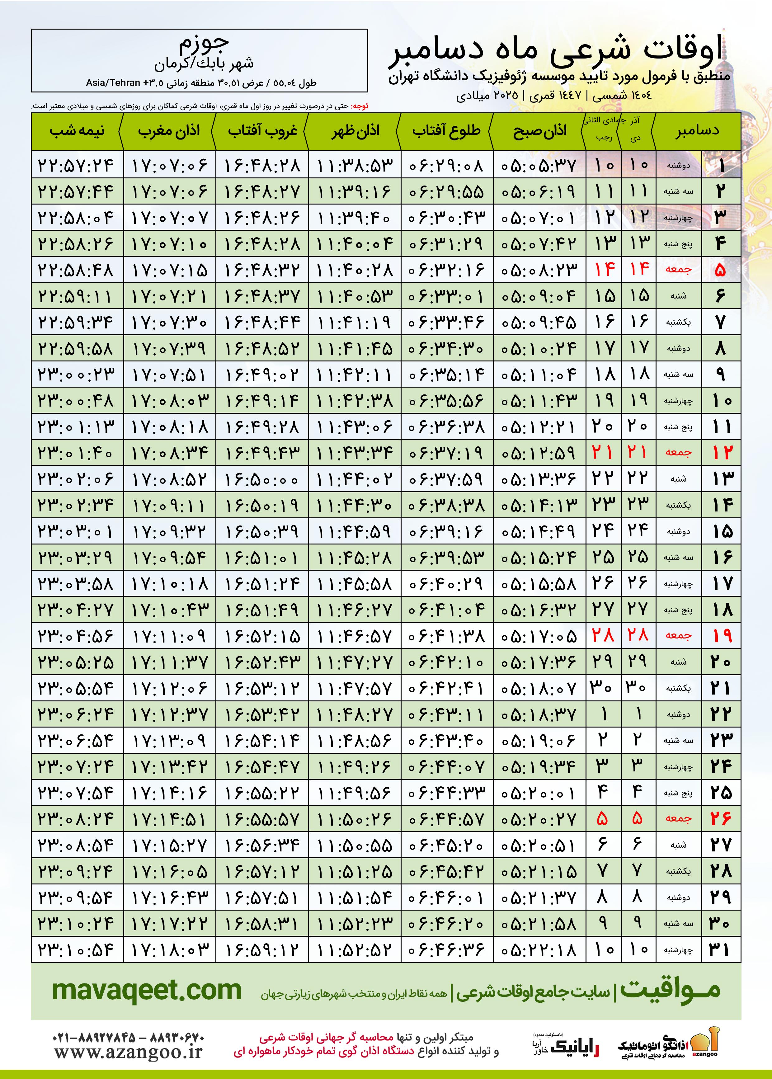 جدول اوقات شرعی دسامبر ٢٠٢٥ میلادی شهر جوزم