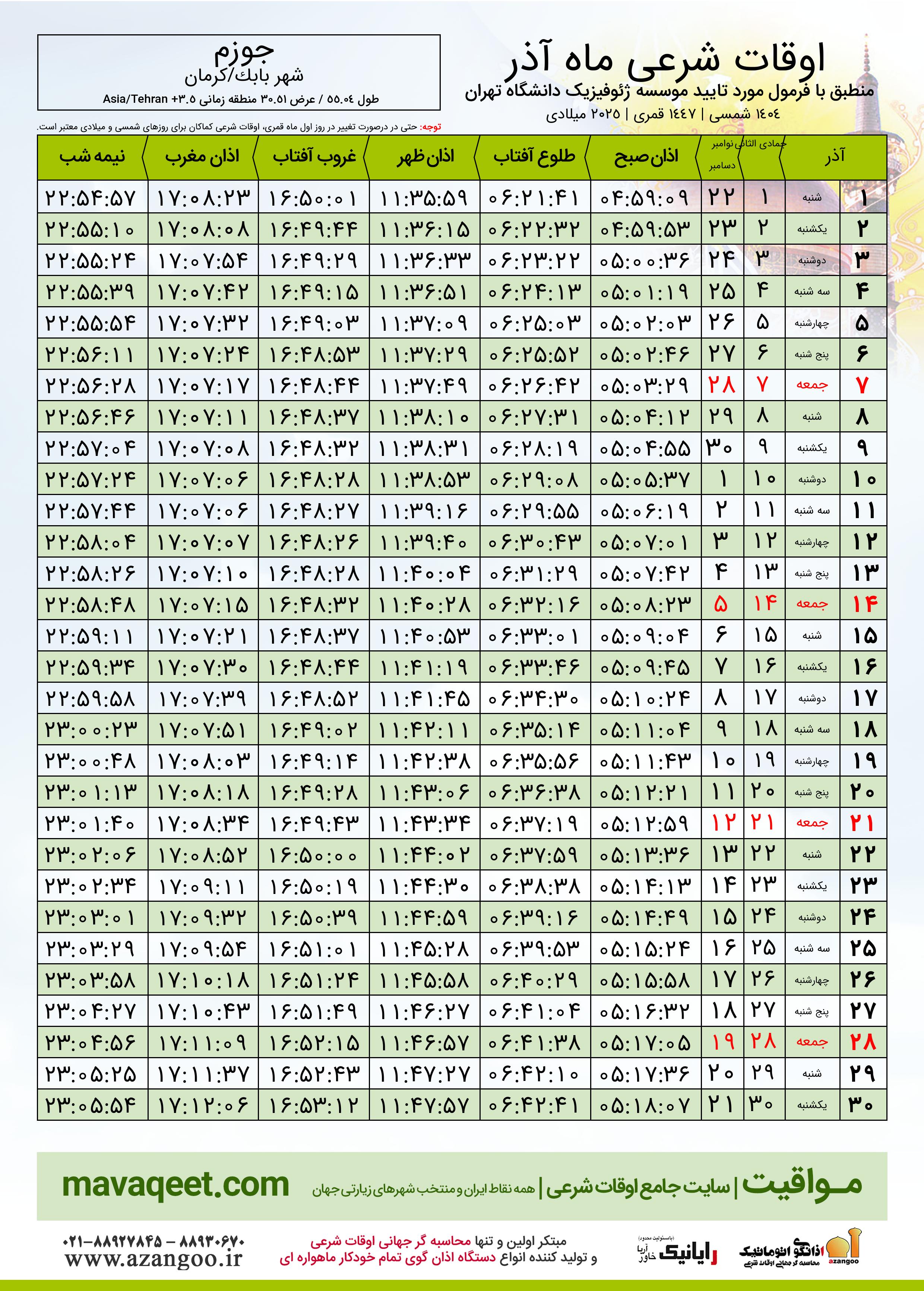 جدول اوقات شرعی آذر ١٤٠٤ شمسی شهر جوزم