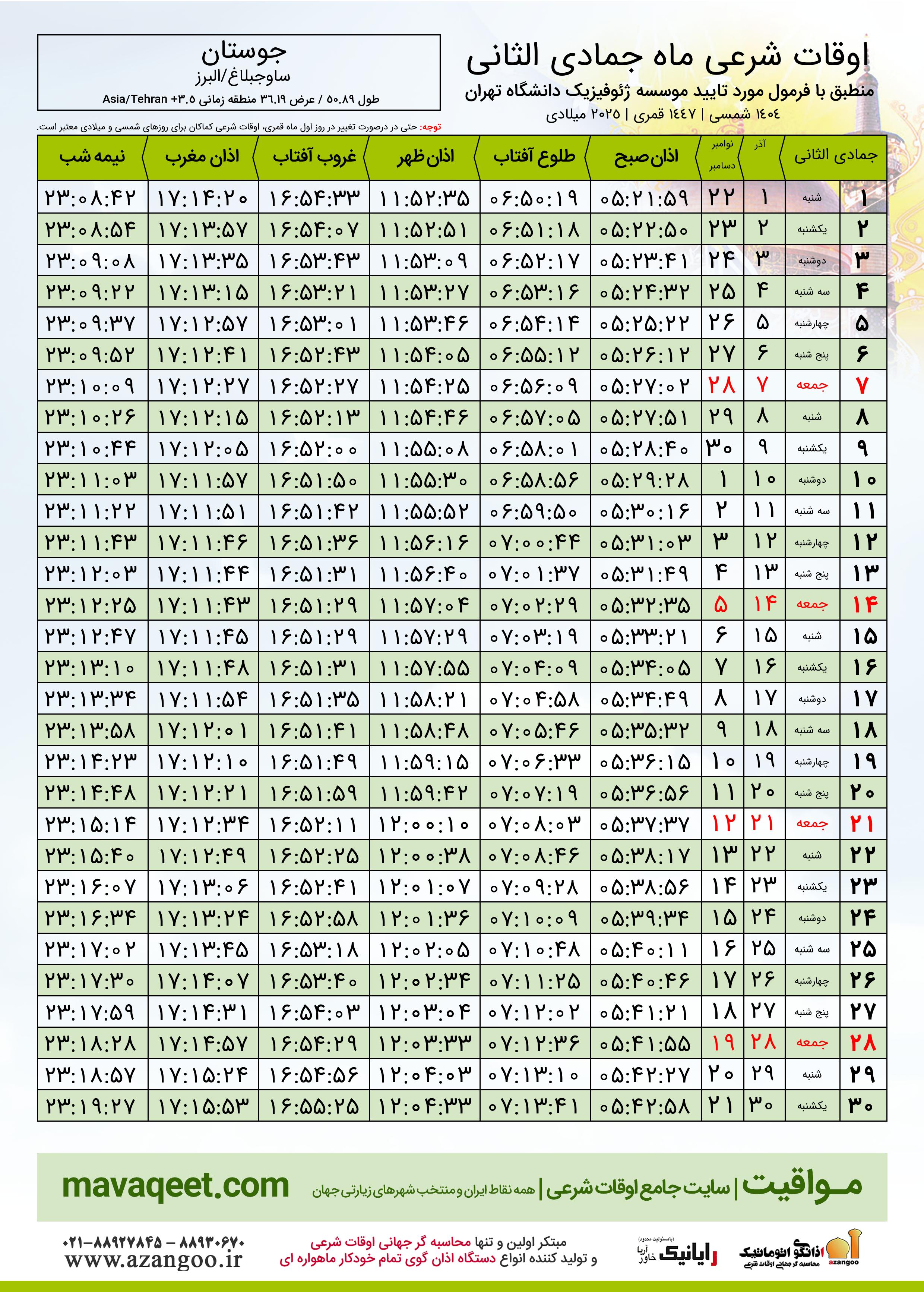 جدول اوقات شرعی جمادی الثانی ١٤٤٧ قمری شهر جوستان