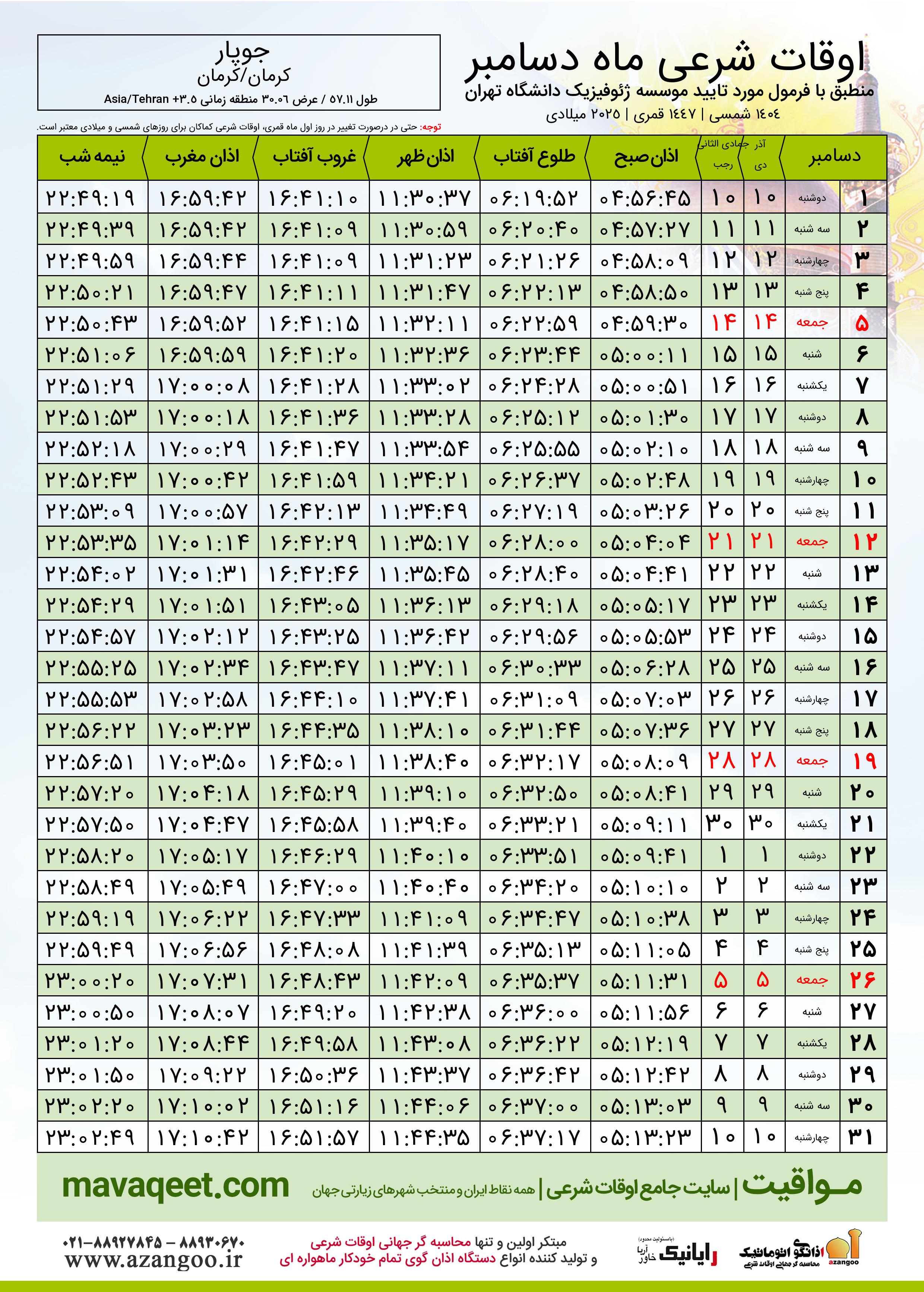 جدول اوقات شرعی دسامبر ٢٠٢٥ میلادی شهر جوپار