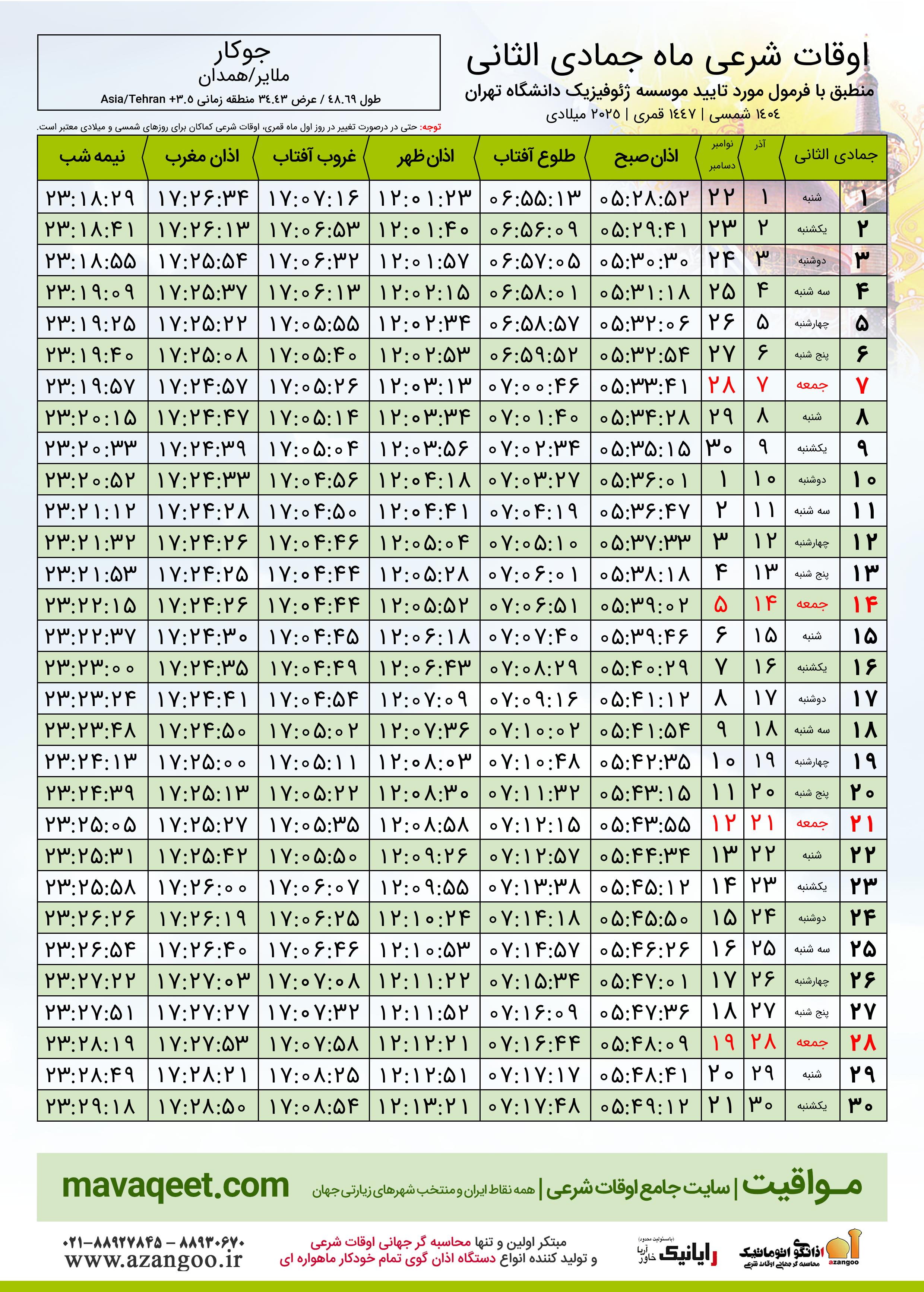 اوقات شرعی ماه جمادی الثانی ١٤٤٧ هـ.ق شهر جوکار بر