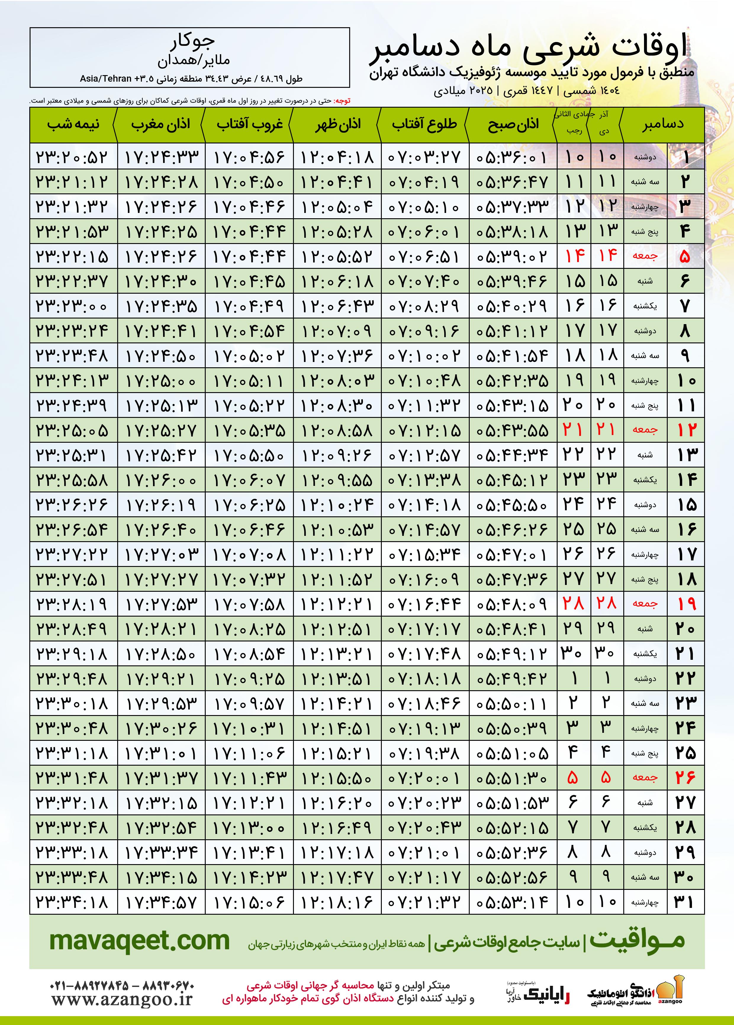 دانلود اوقات شرعی دسامبر ٢٠٢٥ شهر جوکار