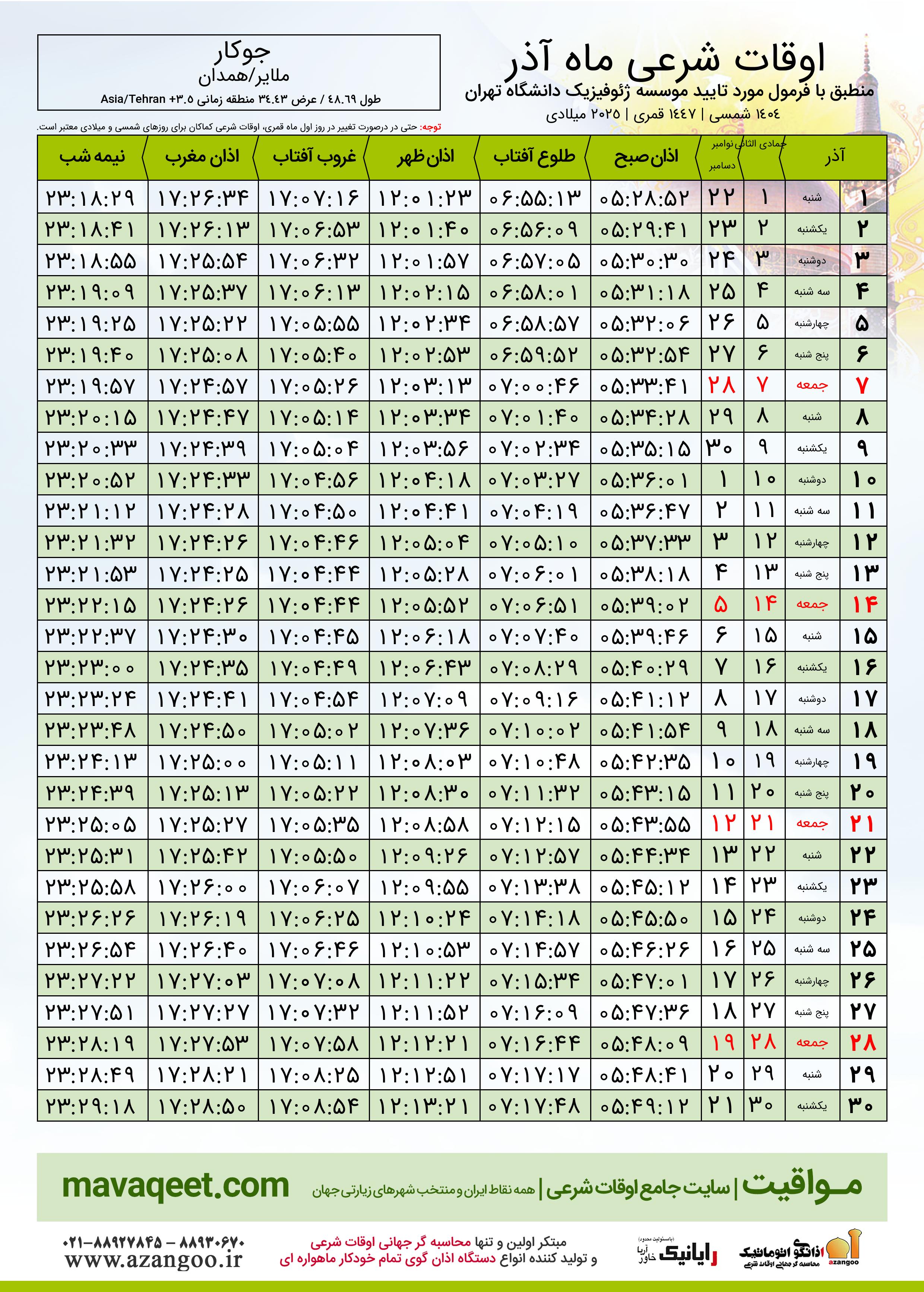 جدول اوقات شرعی آذر ١٤٠٤ شمسی شهر جوکار