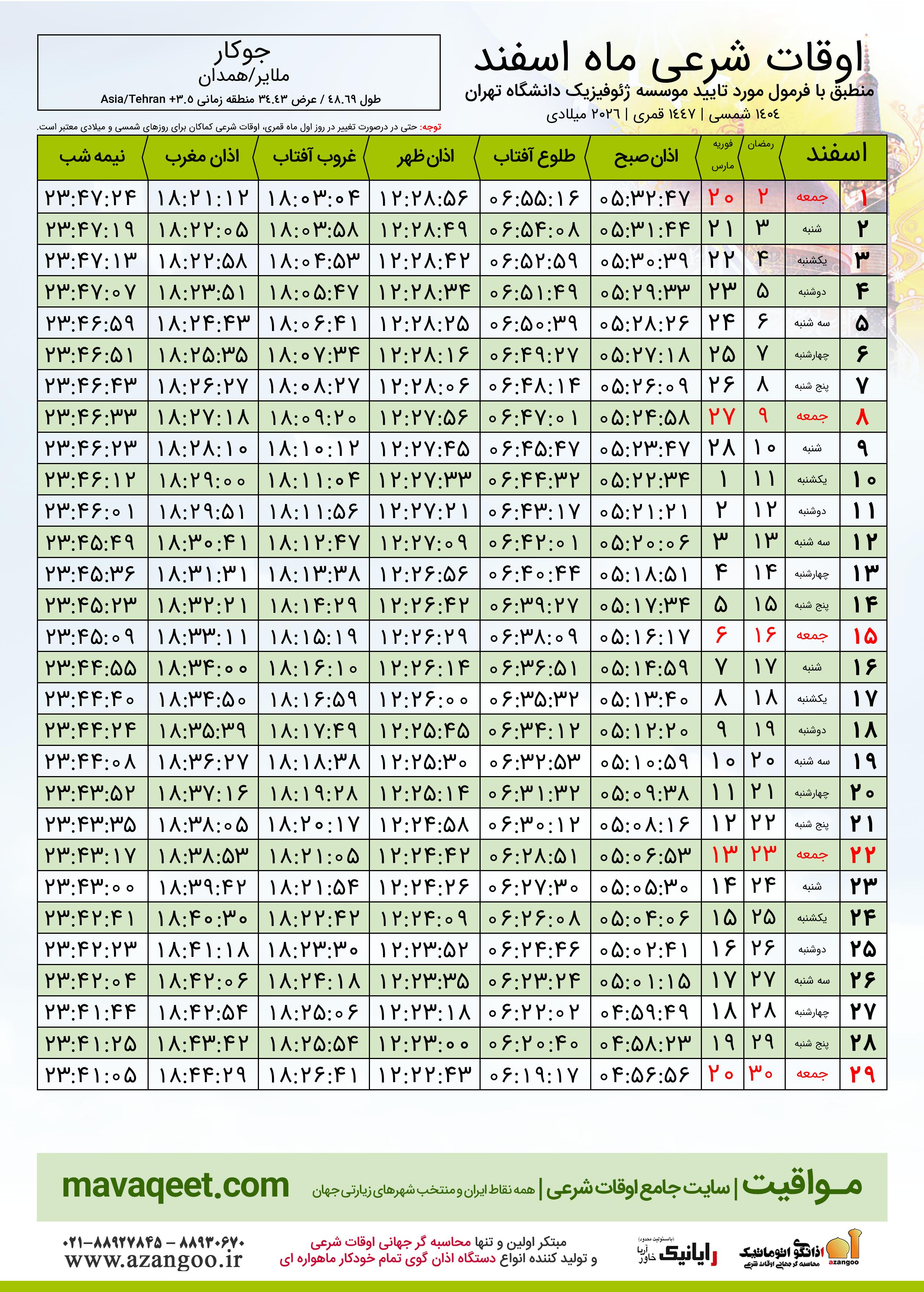 اوقات شرعی اسفند ١٤٠٤ شمسی شهر جوکار