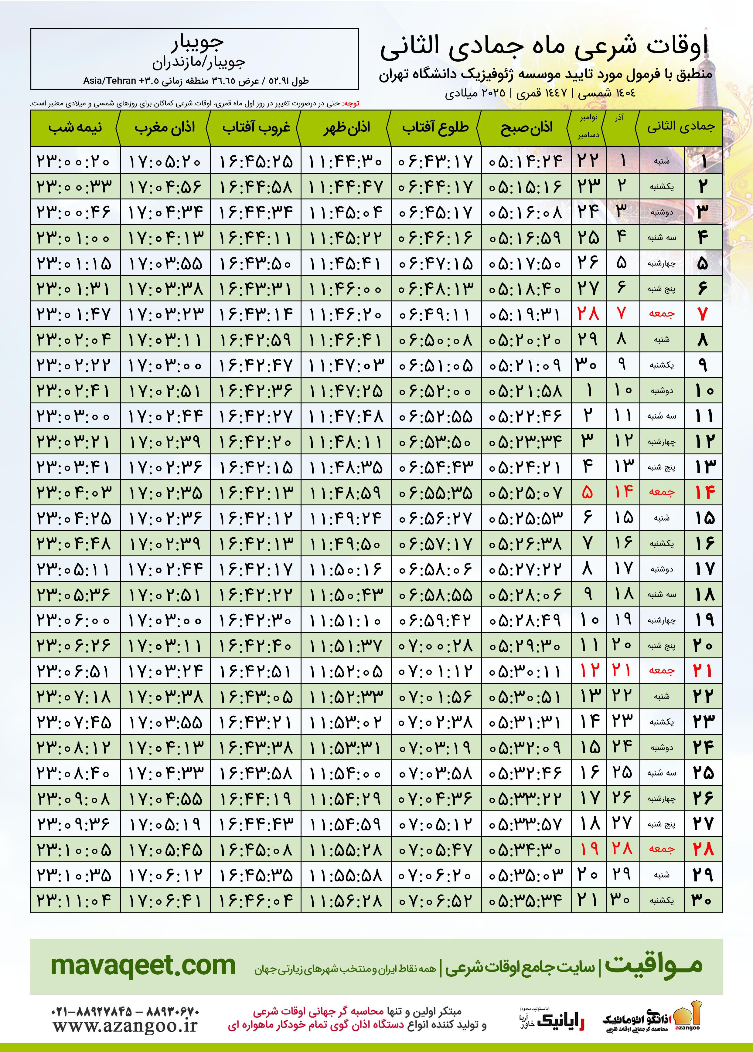 اوقات شرعی ماه جمادی الثانی ١٤٤٧ هـ.ق شهر جویبار بر