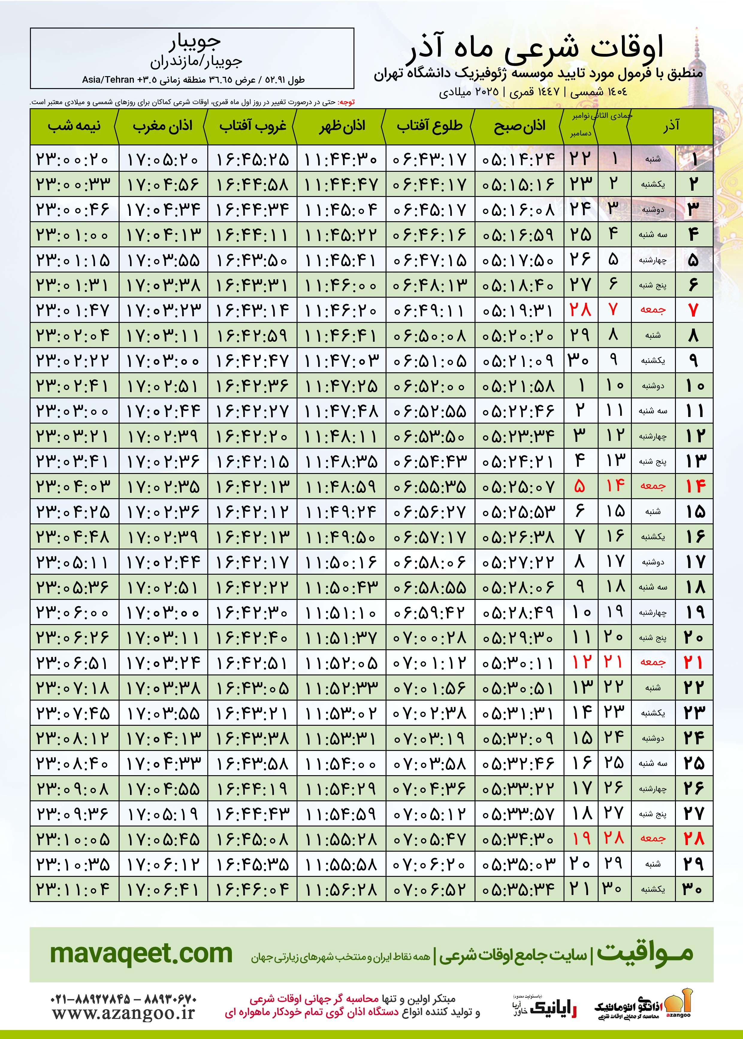 جدول اوقات شرعی آذر ١٤٠٤ شمسی شهر جویبار