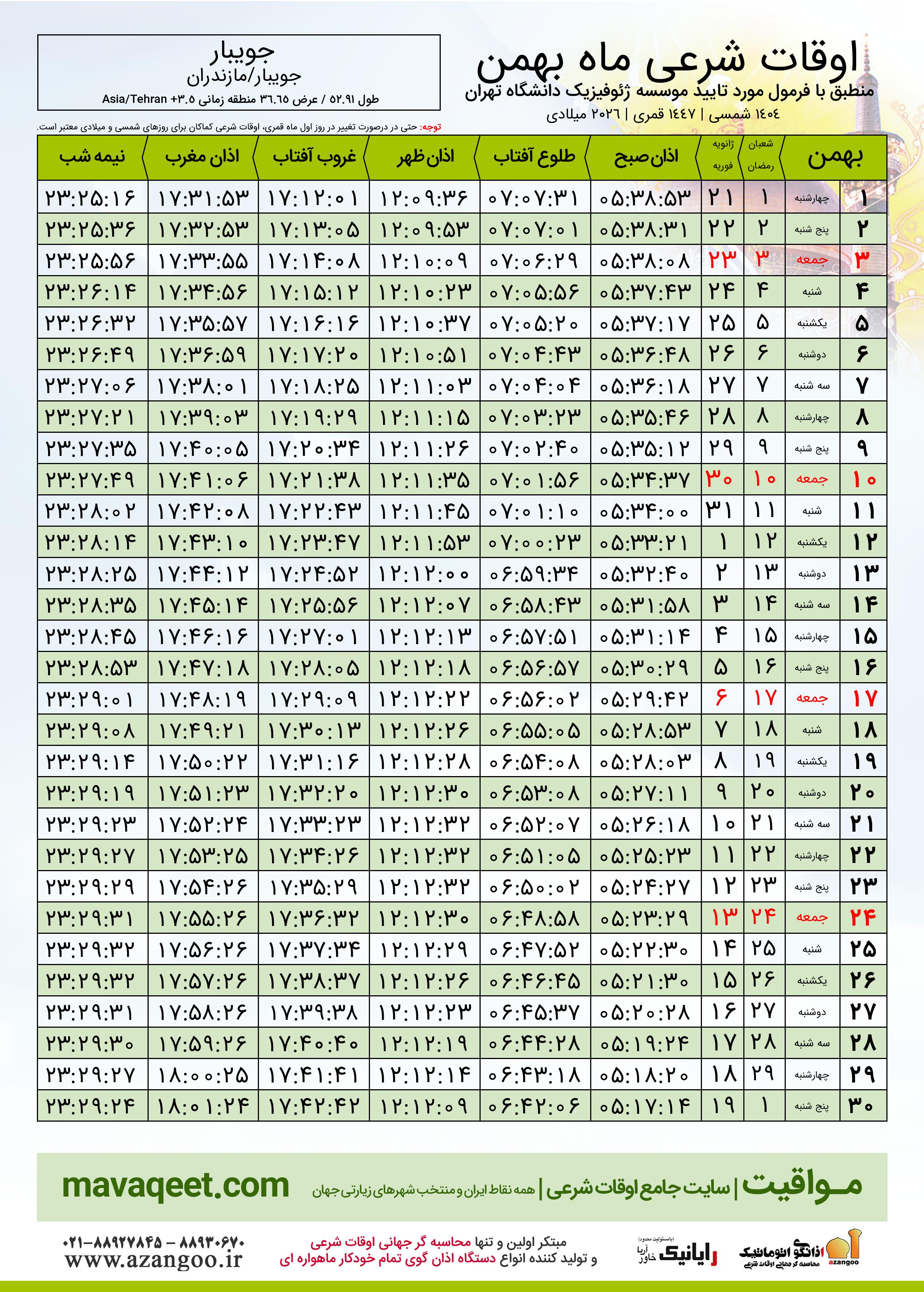 دانلود اوقات شرعی بهمن ٠٤ - ١٤٠٤ شهر جویبار