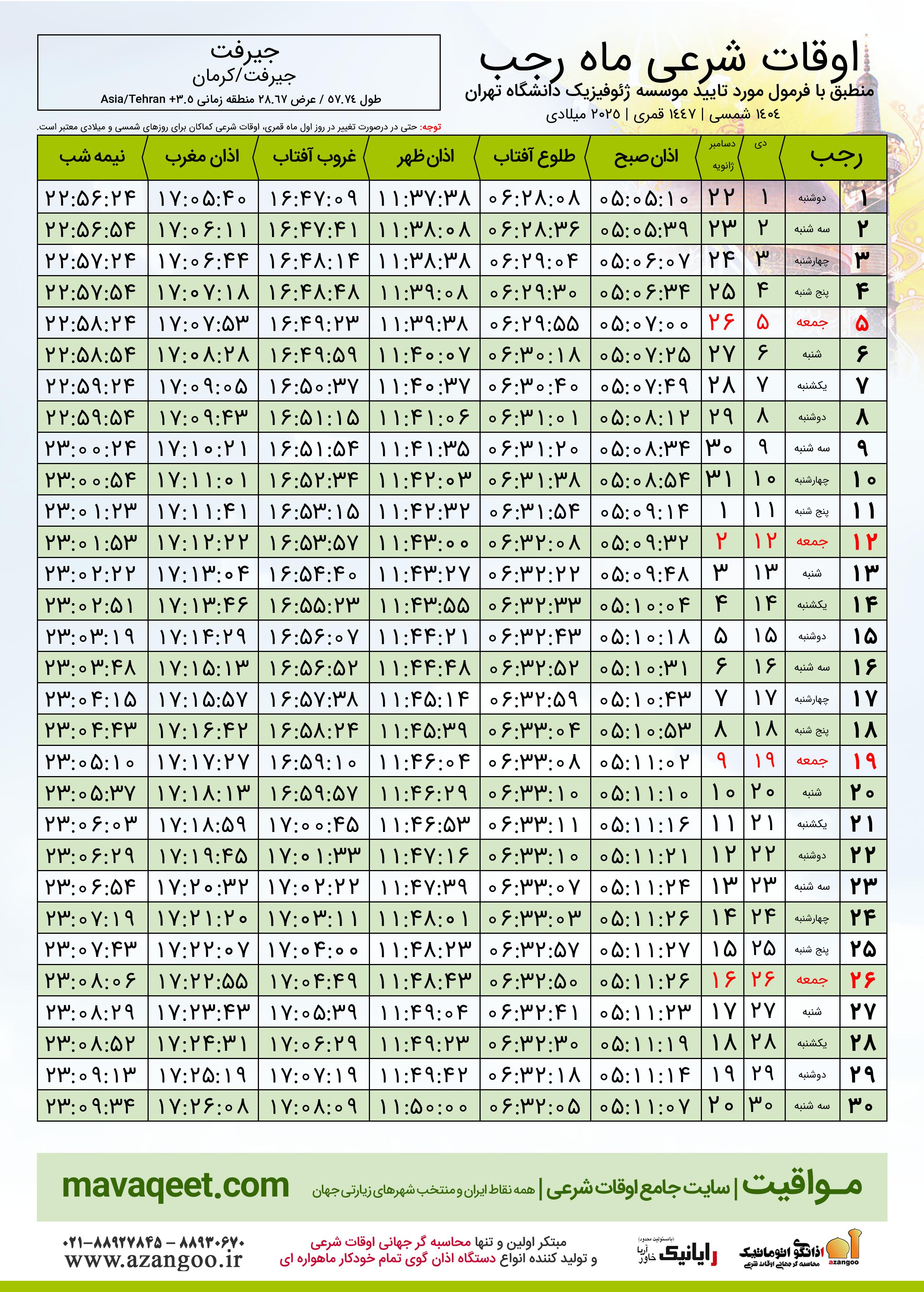 جدول اوقات شرعی رجب ١٤٤٧ قمری شهر جیرفت
