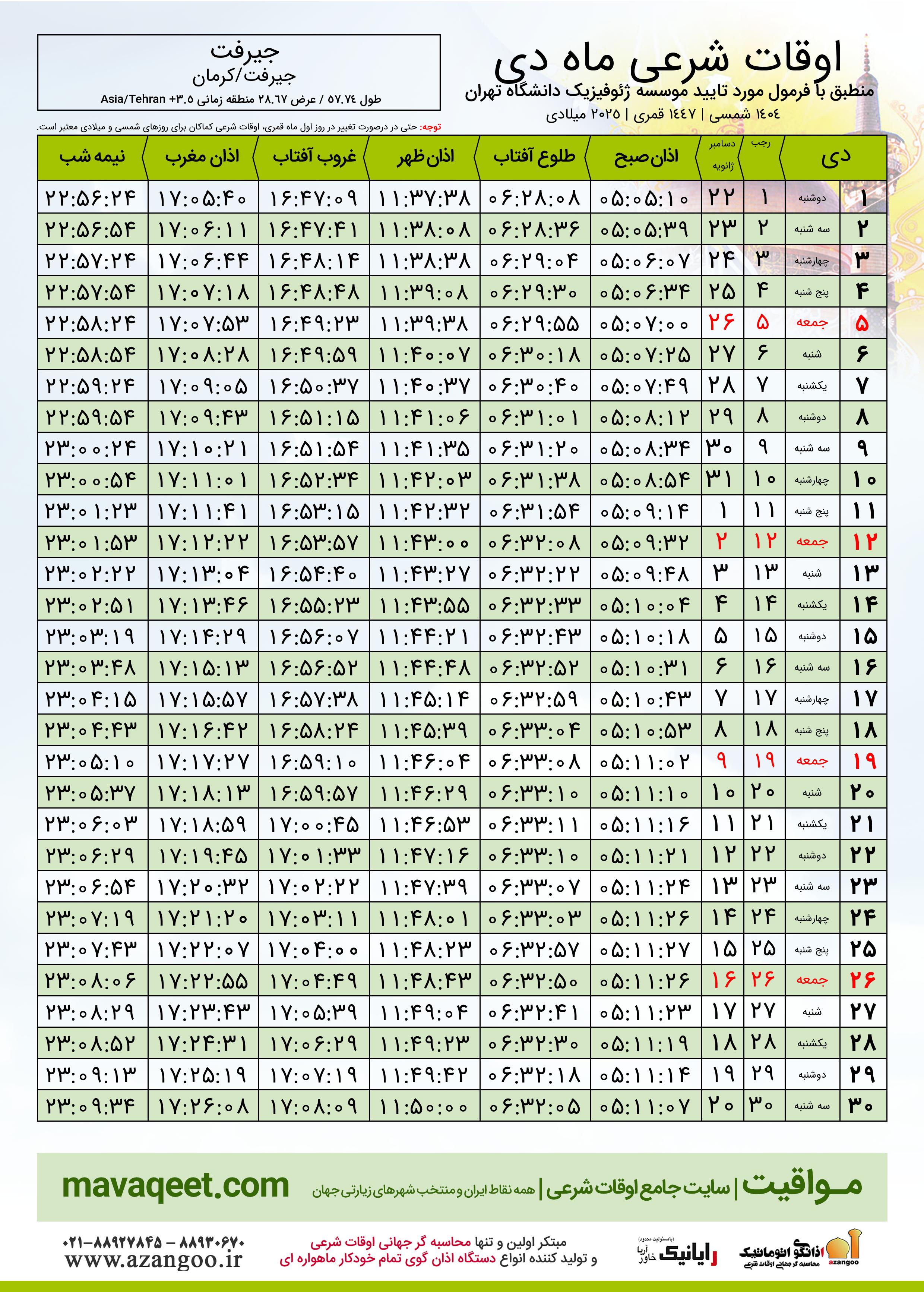 دانلود اوقات شرعی دسامبر ٢٠٢٥ شهر جیرفت