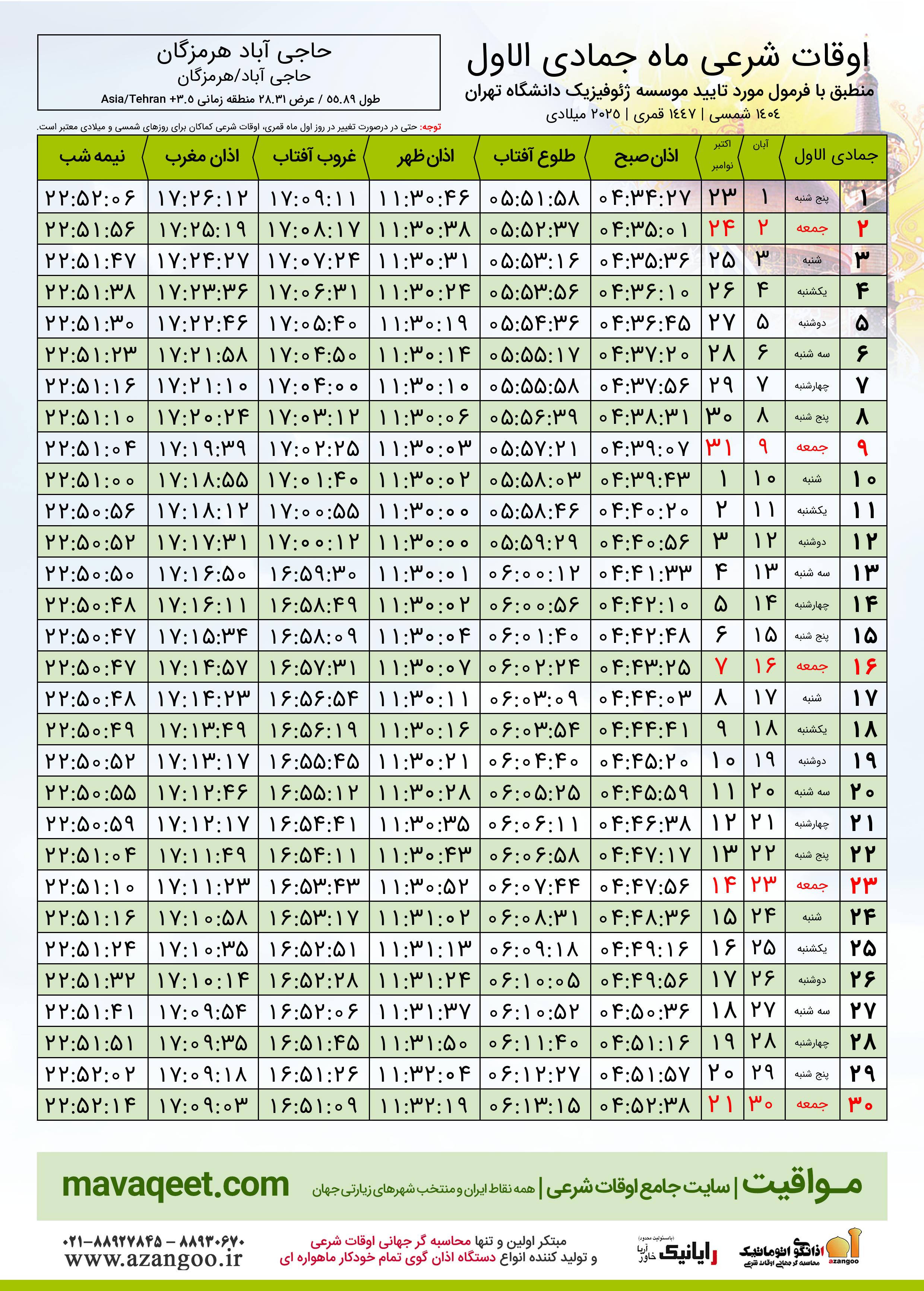 جدول اوقات شرعی جمادی الاول ١٤٤٧ قمری شهر حاجی آباد هرمزگان